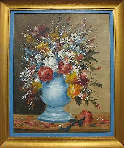 C. (Caesare) Ricciardi oil on canvas floral still life in blue vase; Pennsylvania 1892-1973; signed (L.L.); framed; image size 20" x 16" (no visible defects)