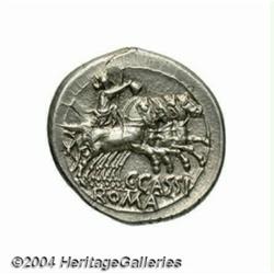 C. Cassius. 126 B.C. AR denarius (20 mm, 3.93 g). Helmeted head of Roma right; urn behind / Libertas driving galloping quadriga right. Crawford 266/1; Sydenham 502; Cassia 1. Toned XF. Important notice: Heritage usually auctions material at the rate of 200-250 lots per hour. On some occasions eBay Live bid software or the Internet may not be able to keep up with the pace of the auction. We recommend placing a realistic absentee bid now as insurance to avoid disappointment. Occasionally the auctioneer may eliminate or reject an eBay Live bid, and the auctioneer may also reopen a lot after the close of the eBay live bidding (usually because we missed an audience bid), and may reject your bid even if it shows you as the winning bidder. By bidding via eBay Live, you agree that Heritage may award the lot to another bidder at its sole discretion under the circumstances described above or any other reasonable circumstances. Also please note that all Heritage lots purchased through eBay Live carry a 20% Buyer's Premium. Please make sure you read the Terms and Conditions before you bid.