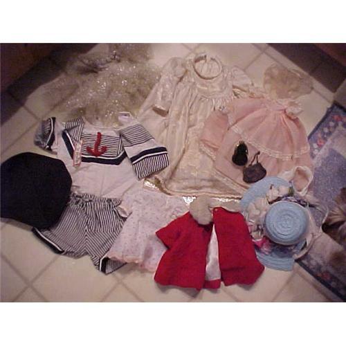 These clothes are in good condition but most need ironing. The Madame Alexander silver tutu came off an 17"Elise, the red velvet coat came off Chatty Cathy, the Berlin sailor suit came off a big compo baby and those are tagged. Plus there are two small purses suitable for an antique or fashion doll,a white cotton dress with matching panties in great condition,a blue straw that came off a 28" antique dollbut is newer,a nice silky dress that also came off an antique doll, and a nylon dress, crinoline, and hat that all matches and would be ok for a more modern doll. I did not see a glaring holes or stains. They are used but lightly. A good selection for a doll doctor to have on hand.