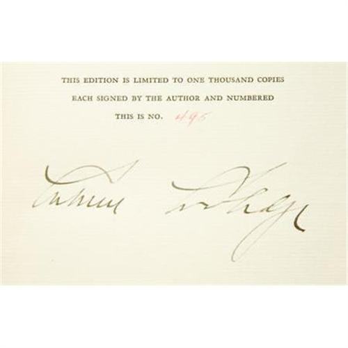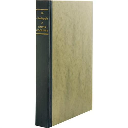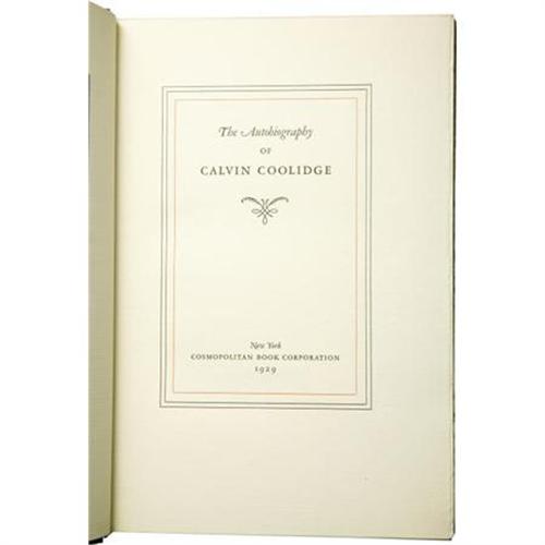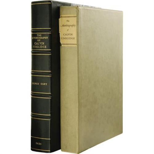 <B>Calvin Coolidge: Signed & Numbered Limited Edition of <I>The Autobiography of Calvin Coolidge</B></I>.</B></I> (New York: Cosmopolitan Book Corporation, 1929), first edition, 247 pages, gray cloth boards backed in blue cloth with gilt lettering on the spine, 8vo (6.25" x 9.5"), protected by the original gray slipcase and a modern custom blue quarter leather slipcase with marbled paper boards and gilt spine lettering. Numbered 495 of 1,000 limited edition copies and signed "<I>Calvin Coolidge</B></I>" on the limitation page. Printed by William Edwin Rudge, Inc. Illustrated with 12 aquatone photographs. "Silent Cal" was one of the last United States presidents to write his own speeches. Following his one and a half terms in the White House (he stepped into the presidency when Warren G. Harding died in office in 1923), Coolidge spent most of his career writing, including a newspaper column on current events and this insightful autobiography. He also appeared often on the new medium of radio, somewhat contrary to his own nickname. The private press copy of his autobiography presented here is in fine condition, with only the faintest wear at the spine and corners. The text, printed on gorgeous Crane's Olde Book paper, is virtually flawless. A rare chance at this fine signed edition of Coolidge's <I>Autobiography</B></I>.<BR><BR><b>Shipping:</b> Books & Catalogs (<a target="_blank" href="http://www.heritageauctions.com/common/shipping.php">view shipping information</a>)