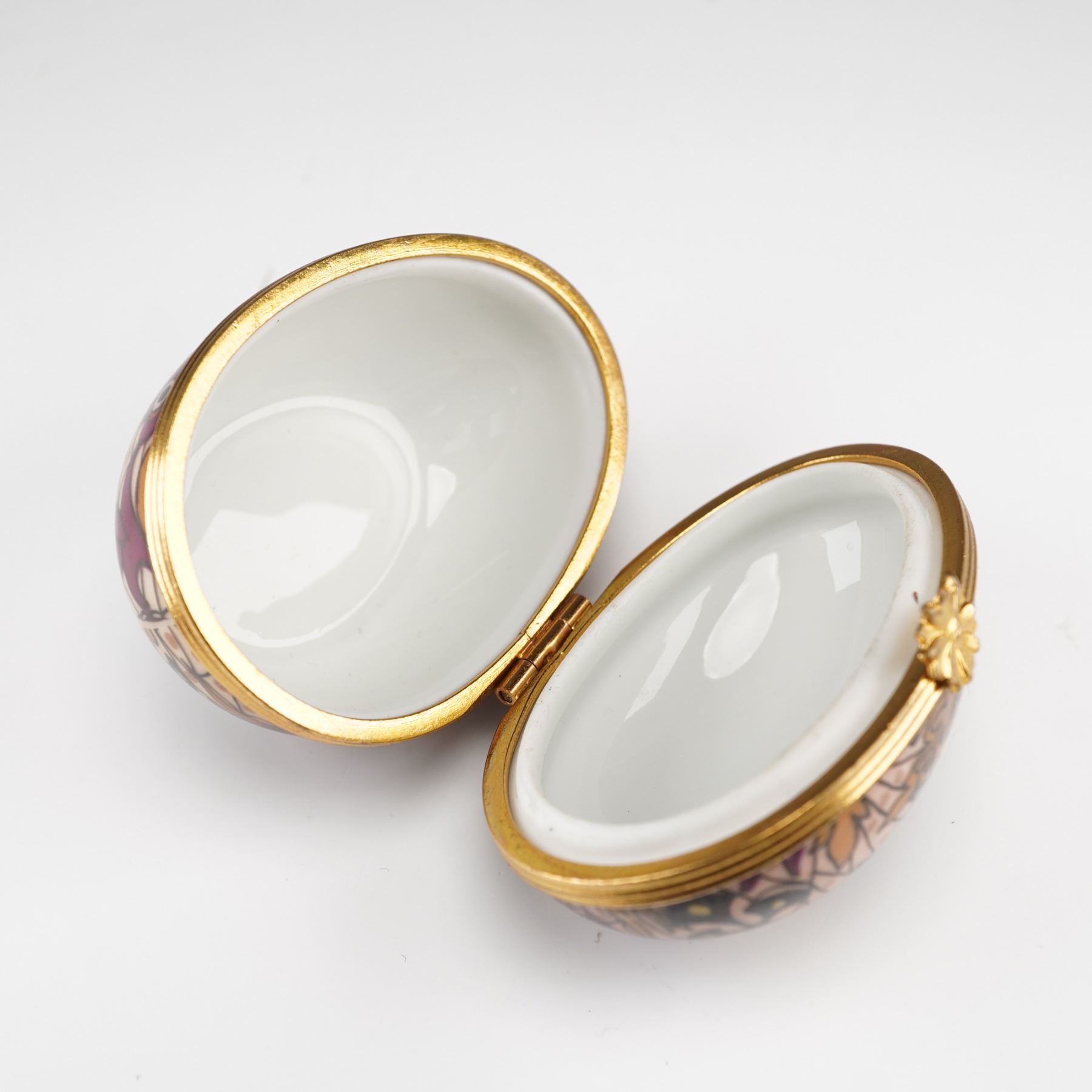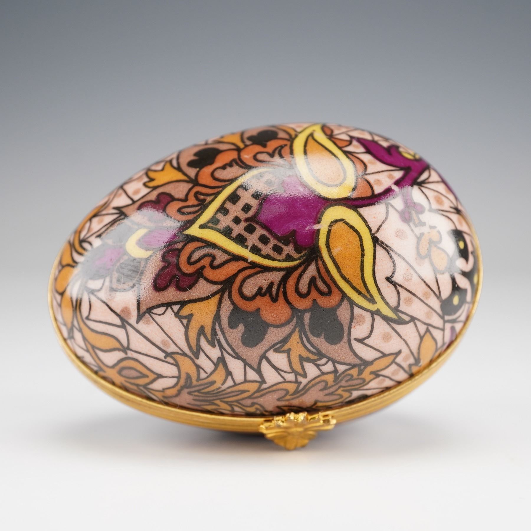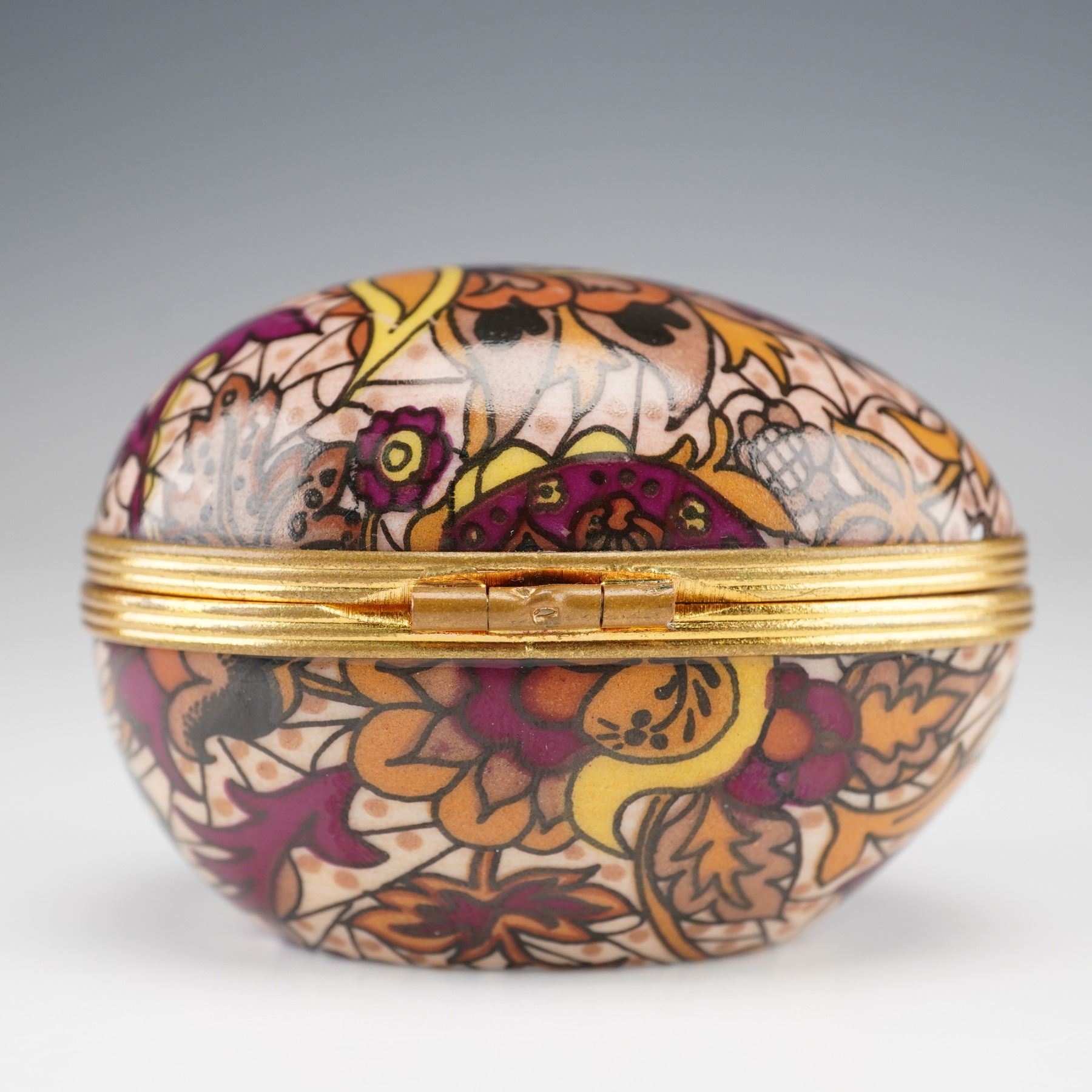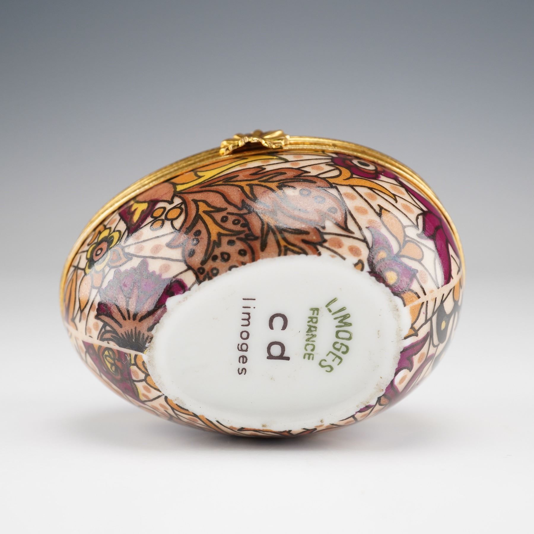 An oval porcelain egg shape box richly decorated with an intricate Art Nouveau inspired floral motif in shades of orange, gold, plum, and black. The hinged mount and clasp are gilt, featuring a daisy-shaped closure. "C d Limoges" stamped to the underside. Limoges France backstamp.
