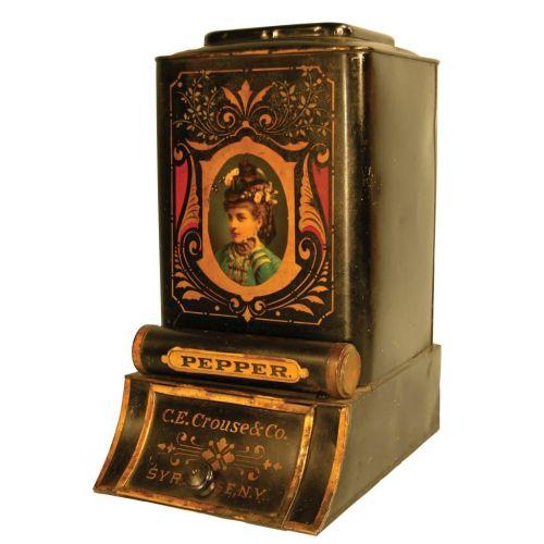 C.E. Crouse and Co. Store Bin for pepper. Some minor discoloration otherwise excellent condition. 8 X 14 1/2 X 11 inches.