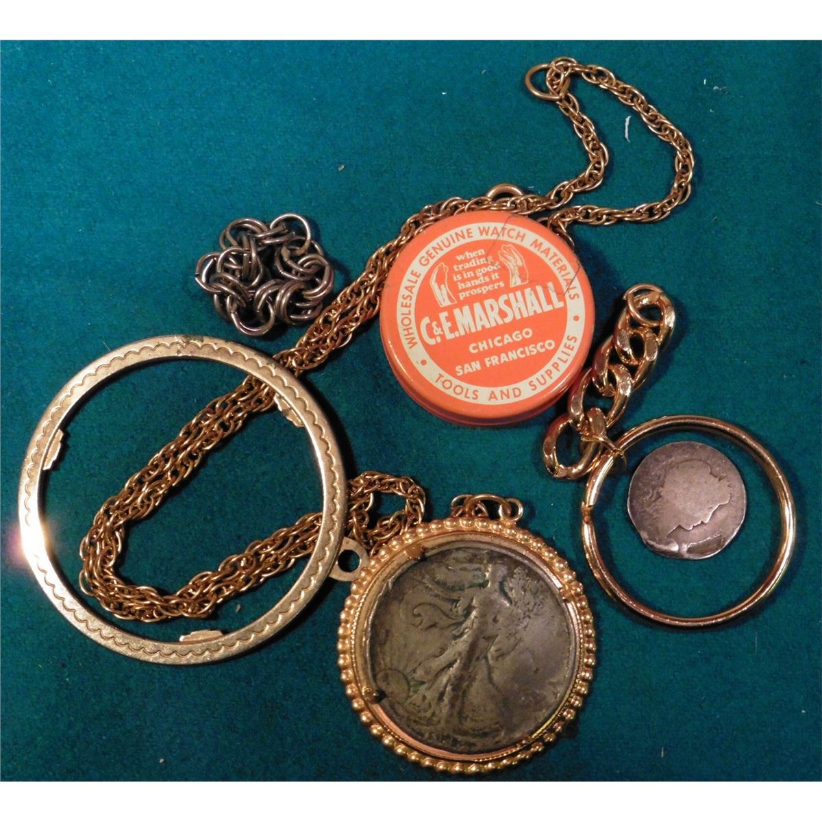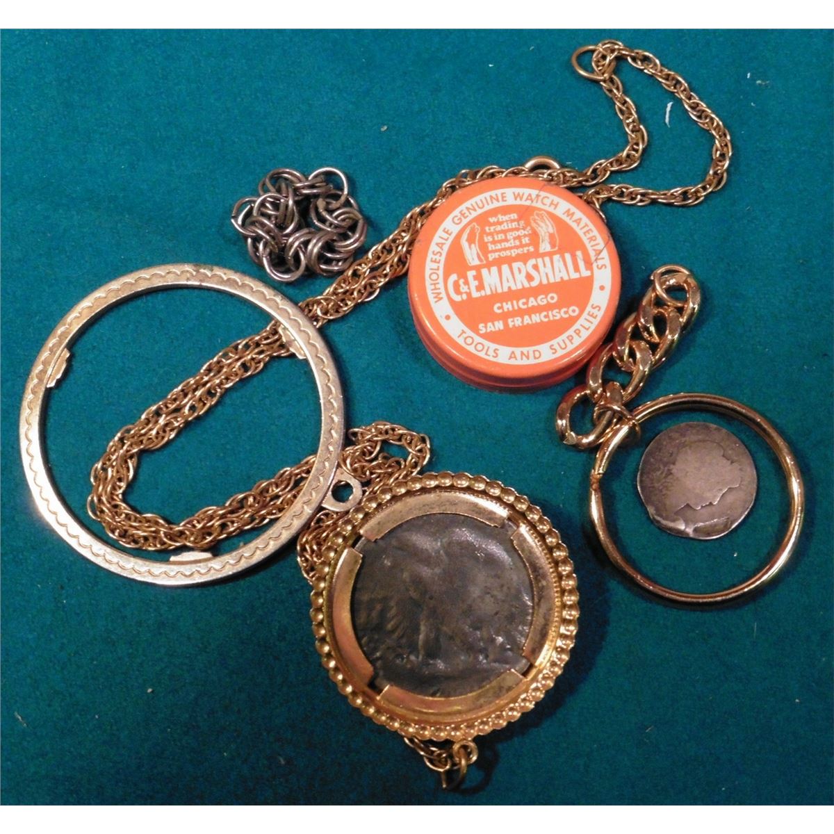 C & E Marshall Watch Part tin top; Chain link ring; Key-chain; well-worn old Barber Dime; Pendant; & a necklace with lead Half Dollar.