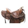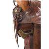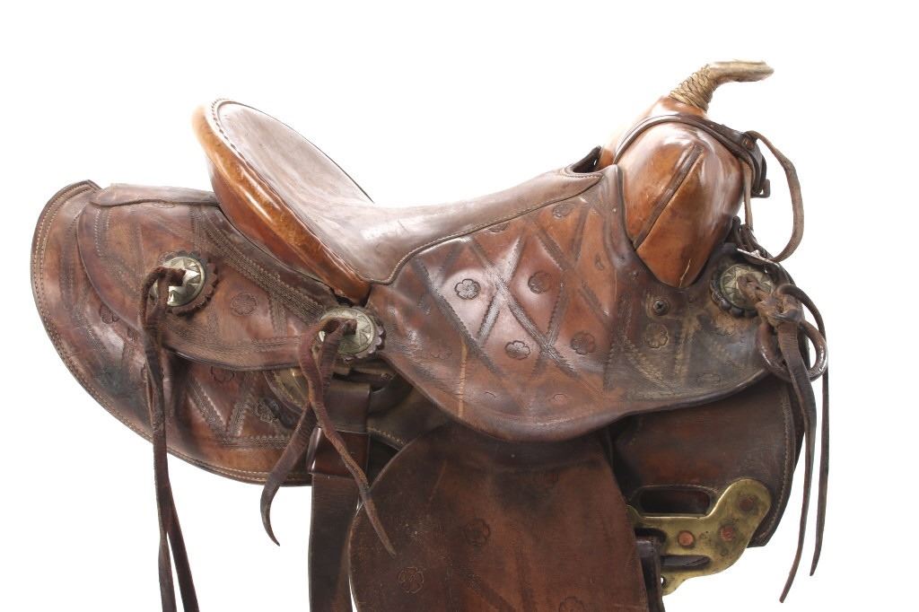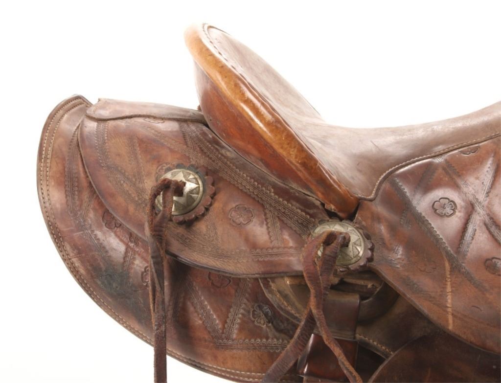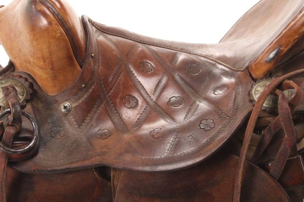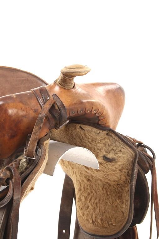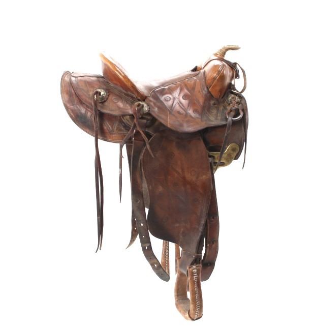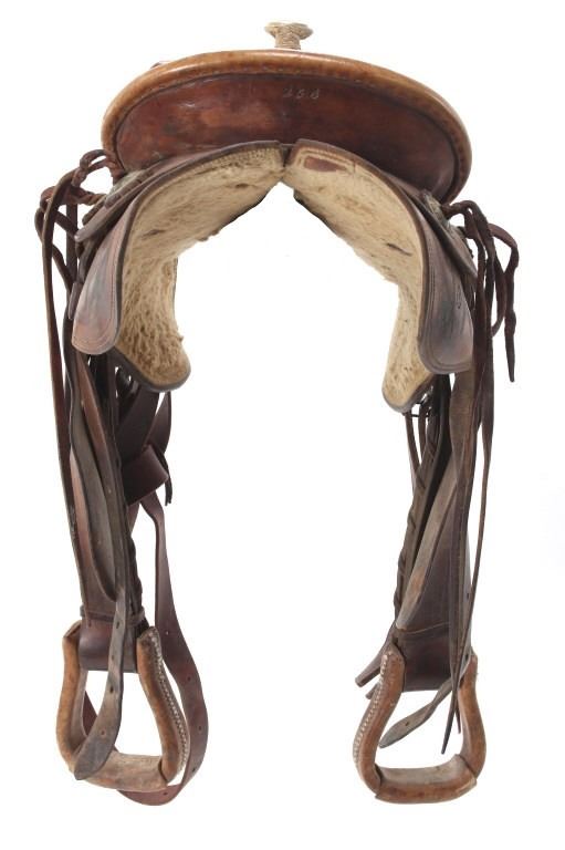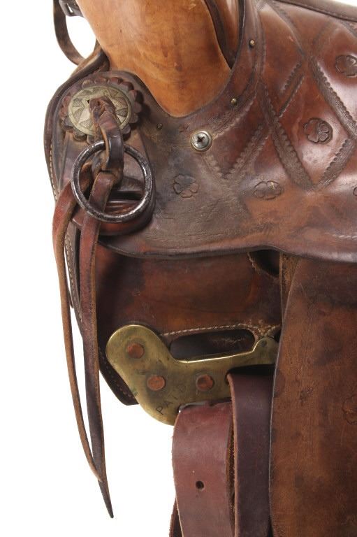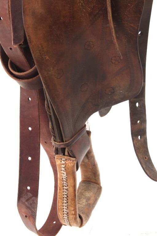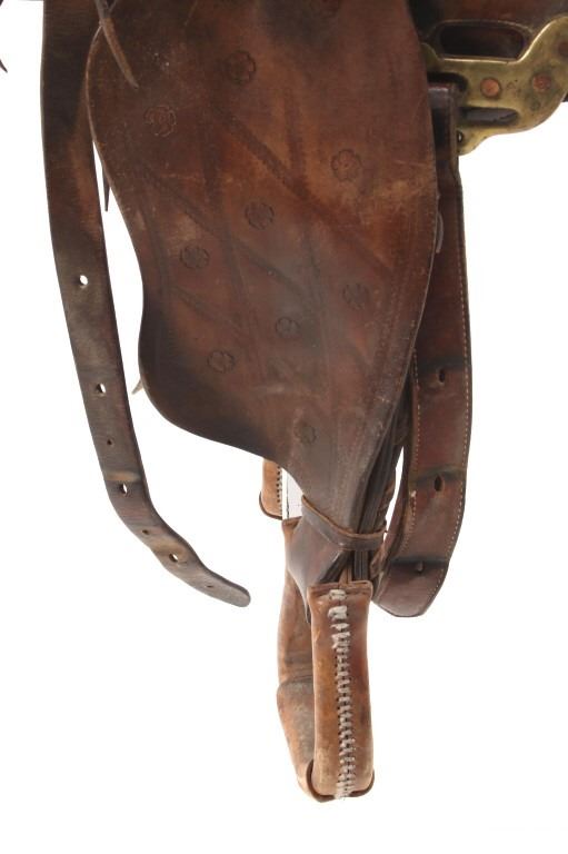 Here is a great chance to bid on one of the finest custom made saddle makers, saddle. This saddle was custom made by W.D. Allison, Montrose Colorado. Walt made all of his saddles with great pride. Walt made saddles from 1909 to 1940. The saddle is in good condition for its age. The saddle has heavy brass fittings a rawhide covered roping horn with a brass button. The saddle is marked "254" on the back of the cantle. The skirt, side jockey, and fender is stamped with a Forget Me Not flower. The saddle has a undercut swell, with a high slope 16" seat, a low height medium angle cantle. The saddle is double rigged with a cinch, a flank strap, and has a flat brass flat plate for the cinch strap with five different cinch attachment options. Each side of the saddle has three large conchos with latigo ties. This saddle is in very good condition for its approximate 100 year age.