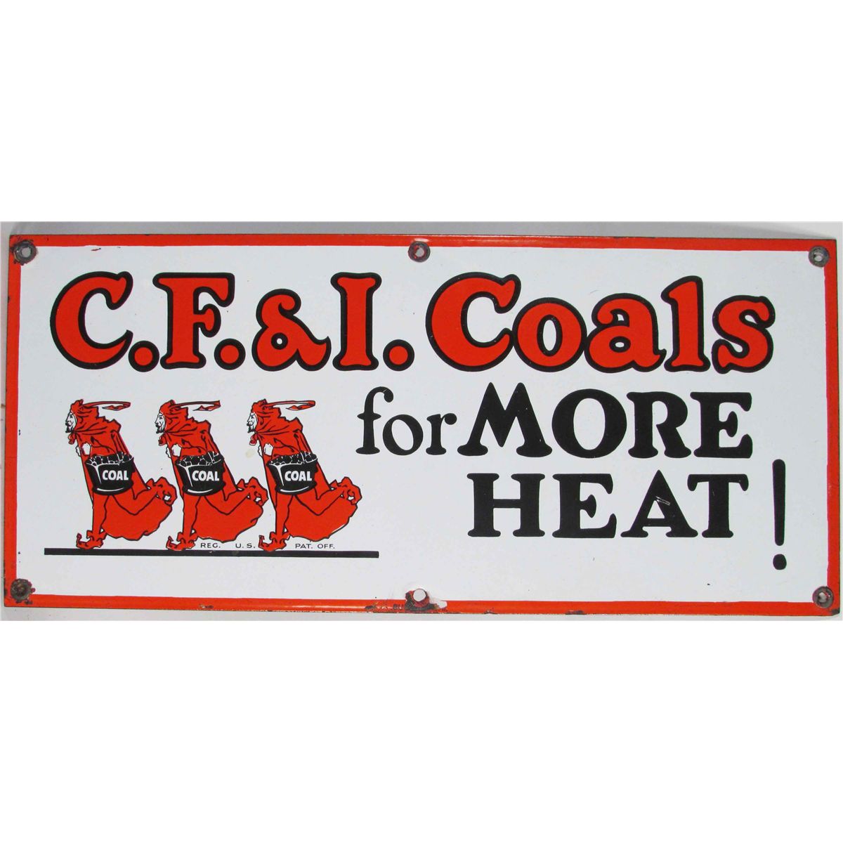 C.F. & I. Coals Porcelain Sign "For More Heat!". Chips mostly around grommets otherwise very good condition. 20 X 9 inches.