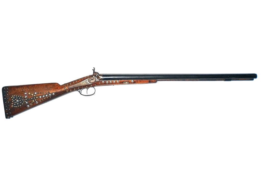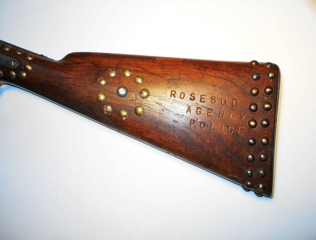 The lot features an original C.F. Schilling & Company St. Louis, Missouri 19th Century engraved double barrel side by side exposed side hammer shotgun with interesting Indian tacked pattern. The nice, large shotgun measures 44 inches total length and marked with silver inset lettering at the top of the barrel, “C.F. SCHILLING & CO. ST. LOUIS MO.” The shotgun shows original highly figure factory engraving across both lock plates on each side, at the top frame attachment to the wood and along with trigger guard and plate. The shotgun bears the original wood with nice original solid brass trade tacks, metal tacks in a nice pattern attributed to the Northern Plains Native American Indians, likely Sioux. The rifle is shows stamping on the stock as marked, “ROSEBUD AGENCY POLICE” and “UNITED STATES INDIAN SERVICE”. Rifles and Shotgun were issued by the U.S. Indian Service to the Reservation Agency Police which was typically manned by tribal members. Many of these firearms are original and many have been later altered to appear as agency issued firearms, the origin of this example is unknown with it being an original 19th Century Engraved firearm with nice original brass tacks. The Rosebud Indian Agency was a Sioux Indian Reservation located in Southern South Dakota and is noted as being the location where may Lakota Oglala Sioux Indians fled after legendary War Chief Crazy Horse was murdered at Fort Robinson, Nebraska in September 1877. The shotgun engraving shows wonderful floral paisley like typical highly figured patterns with one side shows a playful running fox and the other showing two gees or ducks. The barrel to percussion nipple connection has some slight engraving as well and the two barrels are both have a nice deep bluing. The wood stock appears to be original and has the original metal butt and the bottom and end have a dark original patina, with the brass tacks having what appears to be natural patina ranging from dark coloring to a mellow coloring with associating areas of wear. A screw appears to be missing and possible replacement of the left hammer hardware. Provenance: From the ex-collection of Tom Hardy in Indianapolis, Indiana. Antique firearms requires NO FFL transfer or NICS background check.