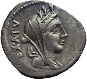 Repubblica Romana. C. Fabius C. f. Hadrianus. Denario, 102 a.C. D/ Busto velato e turrito di Cybele a destra. Dietro, EX.A.PV. R/ Vittoria in biga a destra. Sotto i cavalli, lettera I. Davanti, cicogna. In esergo: C. FABI. C.F. Cr. 322/1b. B.14. AG. g. 3.66 mm. 20.00 Bel BB+/qSPL.