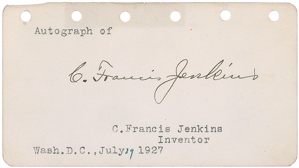 Pioneer of early cinema and one of the inventors of television, though he used mechanical rather than electronic technologies (1867–1934). Vintage fountain pen signature, “C. Francis Jenkins,” on an off-white 4.5 x 2.5 page. In fine condition.