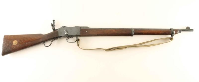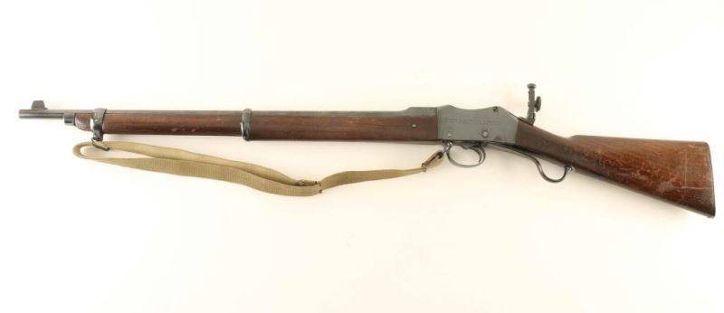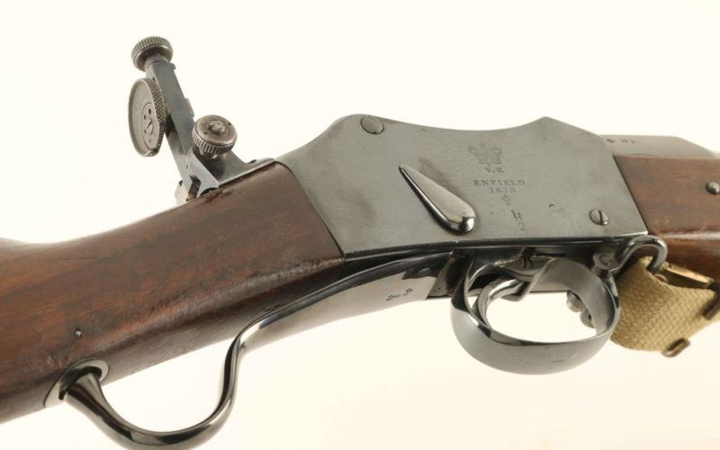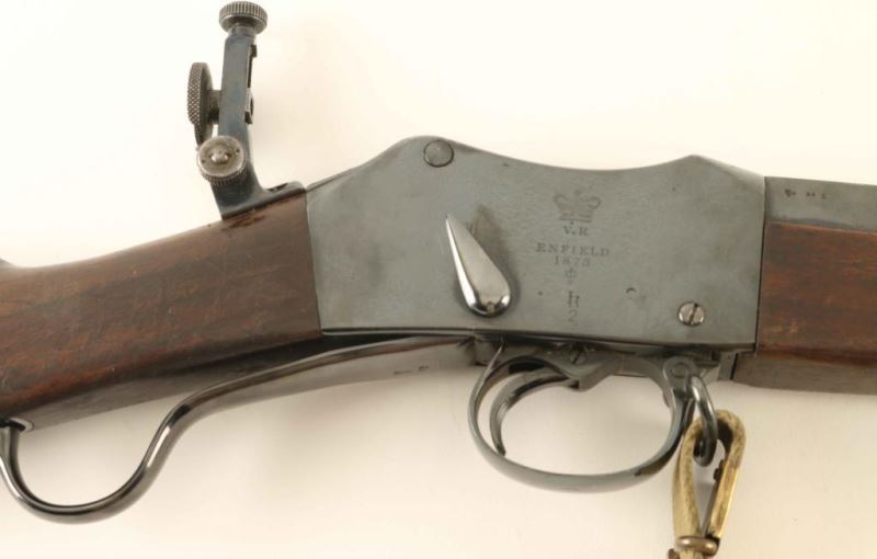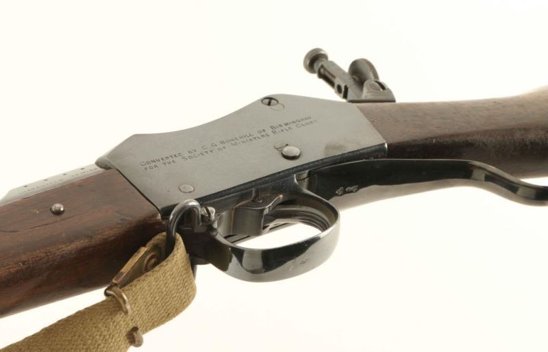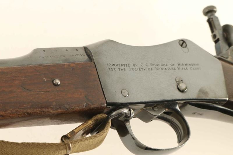 Modified British military lever-operated breech loading single shot service rifle re-chambered for .22 caliber ammunition manufactured circa 1873. Features a bright blued finish with a 26" barrel, ramped blade front sight with white bead, BSA adjustable aperture rear sight mounted on the wrist, two barrel bands, metal forend cap, serrated trigger, short lever, green canvas sling, full length smooth forend and straight grip shoulder stock with brass disc and knurled buttplate. Marked '[crown]/VR, Enfield/1873, and II/2' on the right side of the receiver, 'Converted by C.G. Bonehill of Birmingham for the Society of the Miniature Rifle Clubs' on the left side of the receiver. Barrel is marked 'C.G. Bonehill Birmingham guaranteed British and 22L'. The brass stock disc is marked 'J.T. Thompson .Thorner.' Rifle exhibits approximately 95% of its blued finish showing light scattered wear. Action is sound, bore is pristine and wood stocks are good showing several blemishes with a 2 1/4" extension has been added to the butt. Condition is NRA Very Good as Modified ***Antique Firearm*** From The John F Sukey Collection
