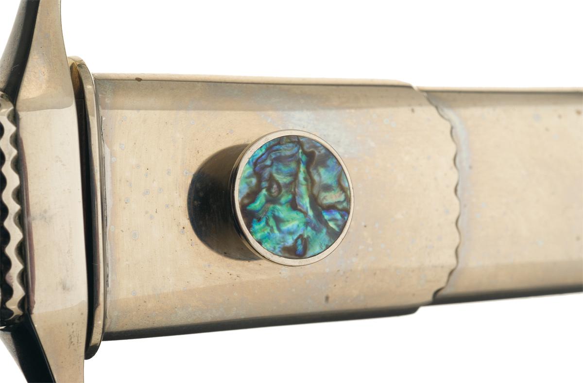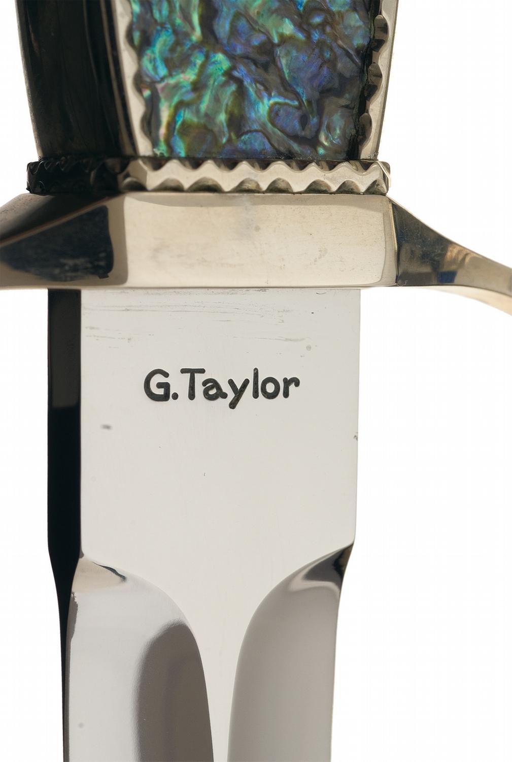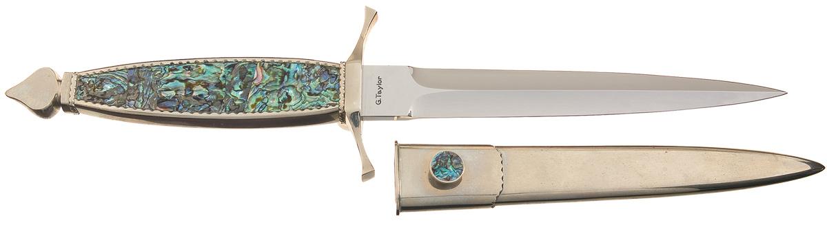 This dagger was fabricated by award winning knife maker C. Gray Taylor. For the past 30 year Taylor has created art in the form of custom knives, and he is a member of the Art Knife Invitational, a prestigious group of 25 of the most collectible knifemakers in the world. Today, he specializes in reproductions of historical multi-blade gentleman folders. This Taylor dagger features a 6 inch blade marked "G. Taylor". Silver fittings with an abalone handle. The dagger is complete with a silver sheath with an abalone adorned carrying stud. OAL: 11 1/4"