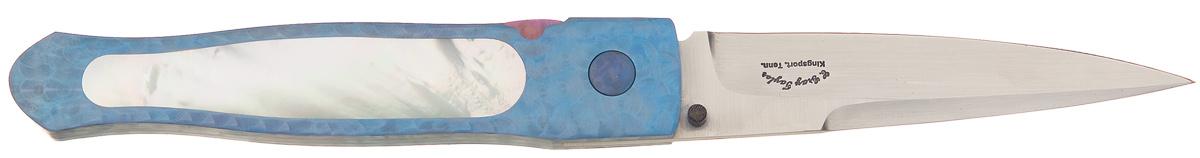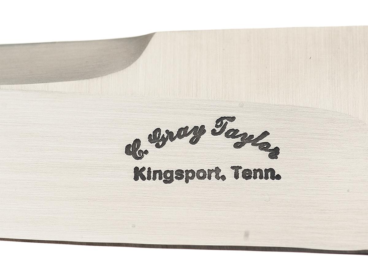 This folding knife was fabricated by award winning knifemaker C. Gray Taylor. For the past 30 year Taylor has created art in the form of custom knives, and he is a member of the Art Knife Invitational, a prestigious group of 25 of the most collectible knifemakers in the world. Today, he specializes in reproductions of historical multi-blade gentleman folders. This folding knife has a 3 3/8 inch blade marked "C. Gray Taylor / Kingsport, Tenn." The blue alloy jeweled frame has mother of pearl inlaid panels. The inside of the frame is also jeweled. OAL: 7 7/8"