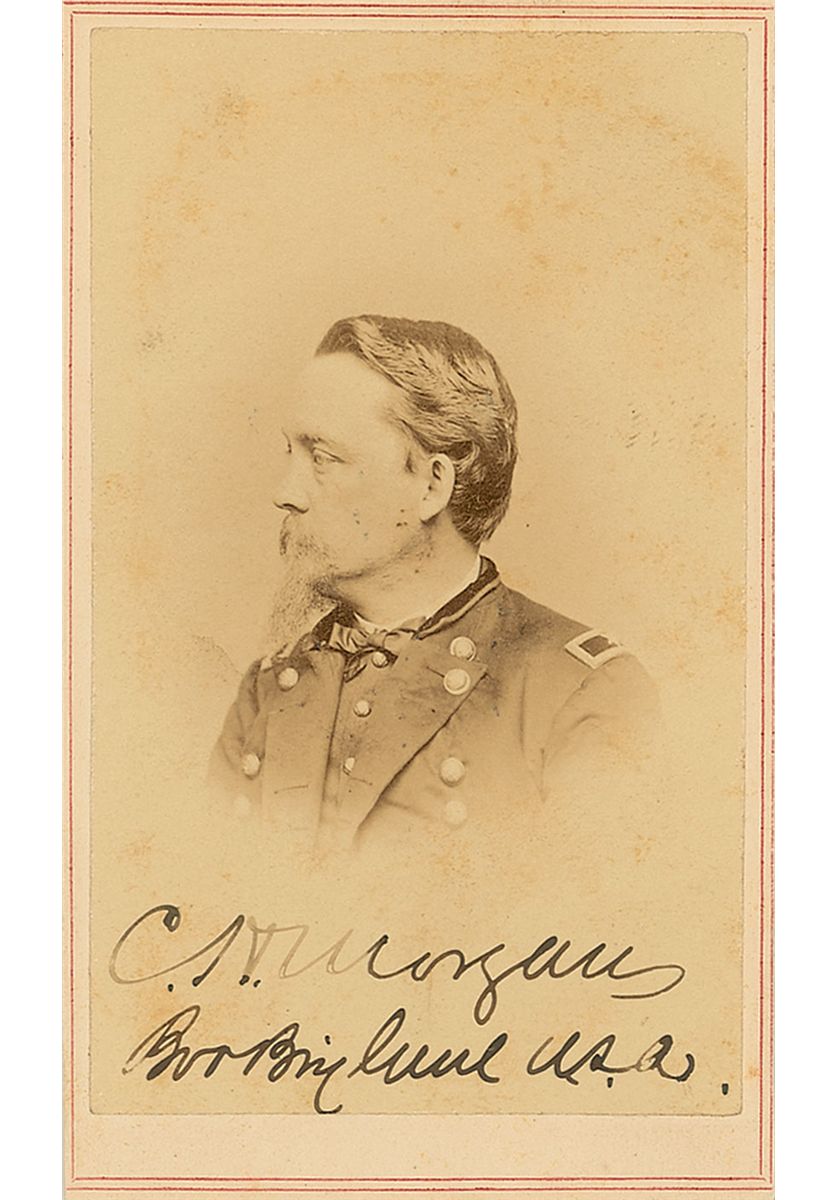 Original 2.25 x 4 carte-de-visite photo by Churchill and Denison of Albany, signed below the image in black ink, “C. H. Morgan, Bvt Brig Genl U.S.A.” In fine condition, with some scattered light toning to background of image.