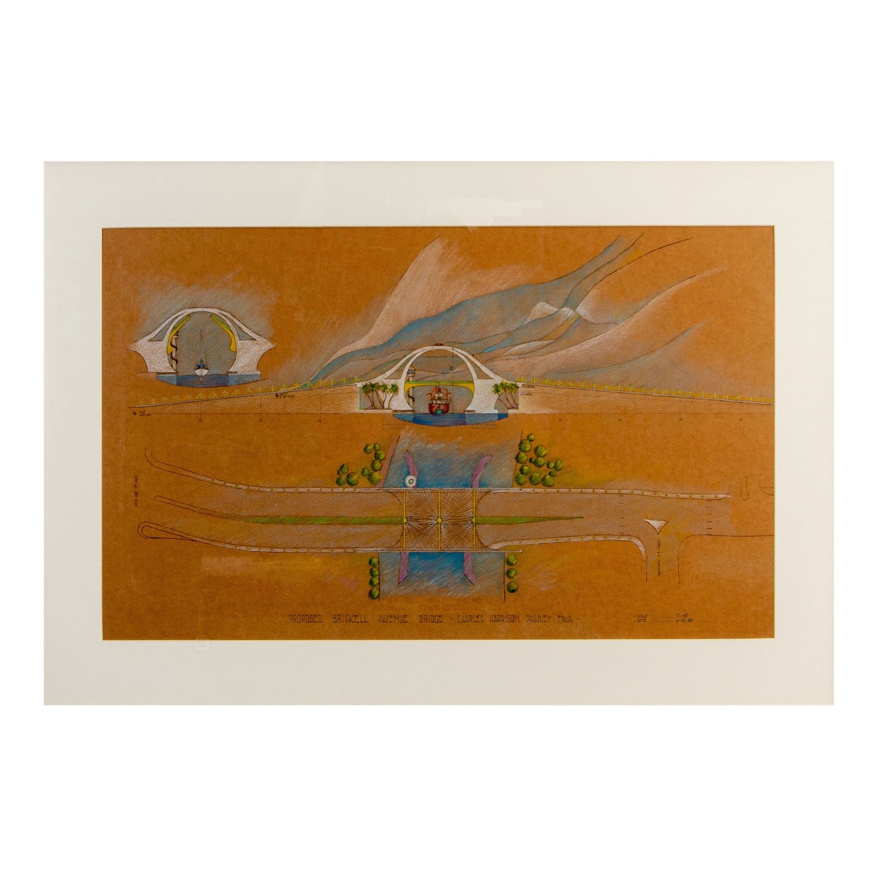 Mixed media on paper. Proposed architect drawing of Miami Florida's Brickell Avenue Bridge. Charles Harrison Pawley was a well-known architect based in Miami, Florida.