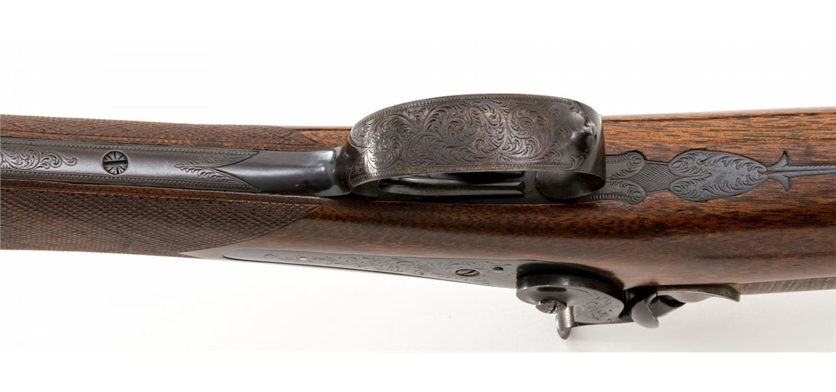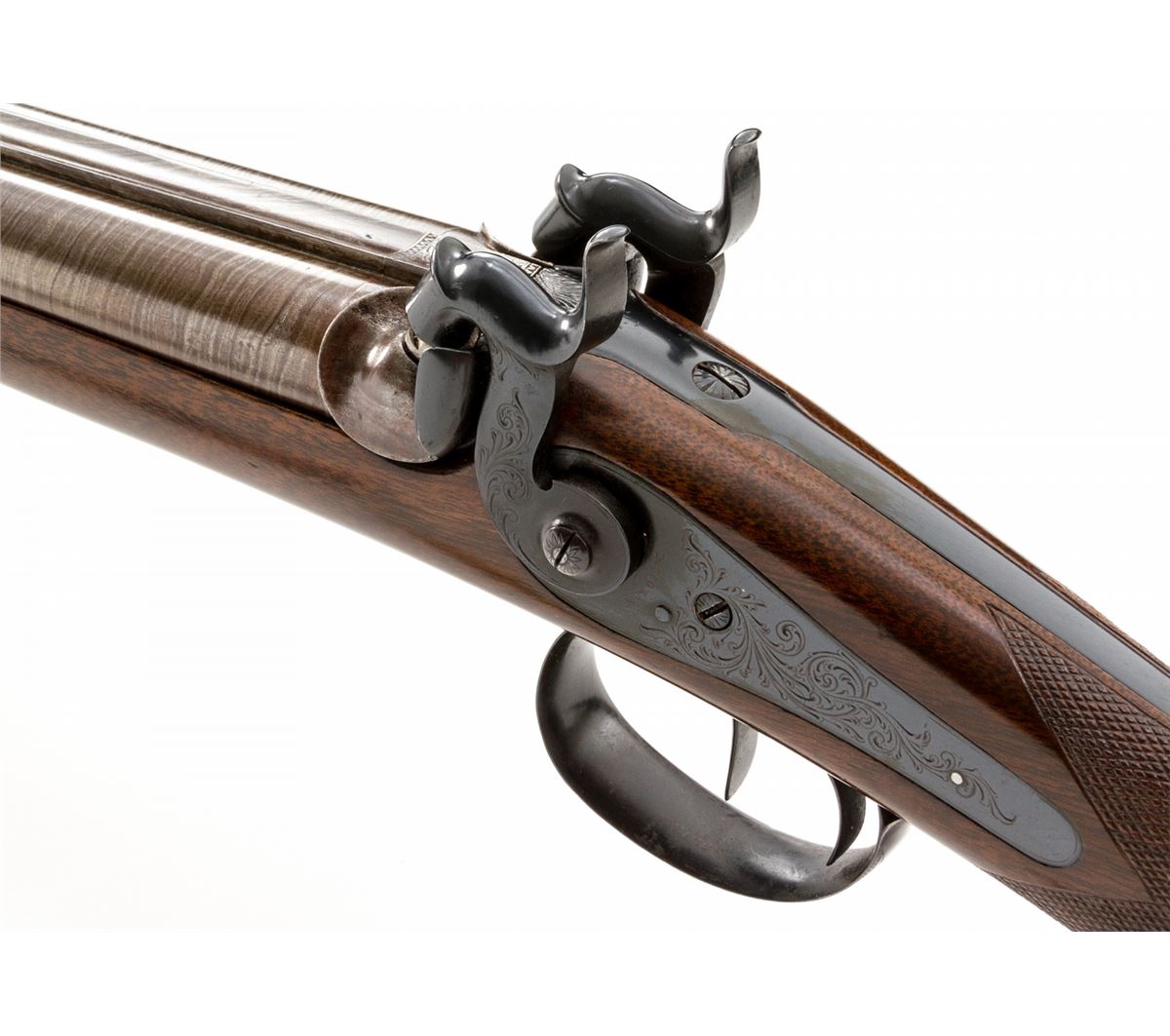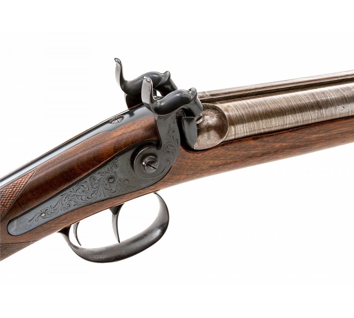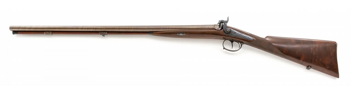 Fine Side-by-Side Percussion Shotgun, marked ''C. Hartung/N.York'', 16 ga., 28'' Damascus barrels with both barrels showing little choke, lightly engraved backlock and hammers; triggerguard and ramrod finial show a finer more English style banknote engraving; straight walnut halfstock shows fine checkering at wrist. Condition is excellent as refurbished. Lockplate, hammers, triggerguard and buttplate show strong immersion blue. Damascus barrels with excellent vivid patterns; clean bolsters and crisp nipples at breech end. Good action, fine bores. Est.: $1,000-$1,500. (Antique)