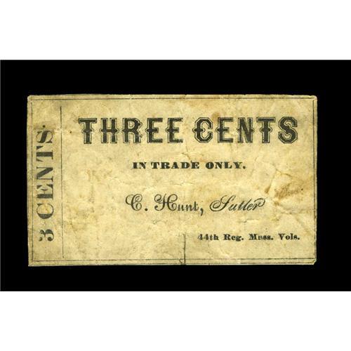 <B>C. Hunt, Sutler 44th Reg. Mass. Vols</B></I> 3¢ Keller MA SC-003<BR>An excessively rare sutler note obtained by our consignor in our May, 1993 sale, where it realized $330. It has not gotten any more common in the intervening twelve years. <B>Fine,</B></I> with a few minor glue stains on the back.