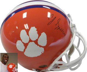 On November 28, 2009. C.J. Spiller set the FBS record for kickoff return touchdowns with seven during his career. He also earned his spot in the record books in another way on that kickoff return, by being only one of five players to ever gain 7000 all-purpose yards. On December 2, 2009, Spiller was voted the 2009 Atlantic Coast Conference Player of the Year. The all-purpose threat was named as the league's top player following a vote of 40 members of the Atlantic Coast Sports Media Association. Spiller was the nation's only player this season to account for touchdowns five different ways—rushing, passing, receiving, and on kick and punt returns—and had passing, rushing and receiving TDs in one game. He returned four kickoffs and a punt for scores this year and has eight total returns for TDs during his career. CJ Spiller has hand autographed this Clemson Tigers Full Size Replica Helmet. James Spence Hologram, Photo from the Signing and Certificate of Authenticity.