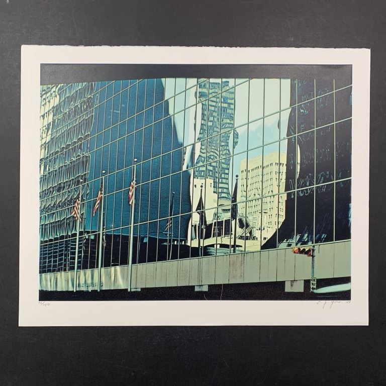C.J. Yao's "Entex" limited edition print, signed and dated lower right amd numbered 78/250 lower left. This piece is of the side of an office building with the reflection of other buildings, and American flags in front of it. This piece is in excellent condition.