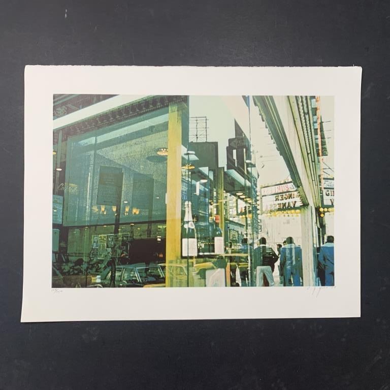 C.J. Yao's "Liquor Store Reflection" limited edition print, signed lower right and numbered 156/250 lower left. This piece is a scene in downtown New York, as a reflection from a liquor store's front window. This piece is in great condition with a very minor fold upper right corner