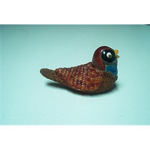 Featuring a C.K. Original. Very unusal bird figurine. Bottom is engraved: C. K. The head and beak and eyes are made of different colors of pieces of cut Porcelain. The porcelain is cut and designed in colors of turquoise, black, yellow and burgandy. Beautifully handcrafted cut porcelain. The top part of the body is decorated with brown-burgandy colored birdseed which details the wings and feathers. The lower body of this bird is covered with a smaller birdseed. This bird figurine measures: 3 1/8 inches long; stands 2 1/2 inches tall; base measures 1 1/4 inches long by 1 inch wide. Turqouise color porcelain forms the neckline; black porcelain forms the neck and area around the eyes; yellow porcelain forms the beak; and the brown-burgandy forms the back of head and top of the head. The eyes are tiny white, quarter moonshaped, eyes with a very tiny, round, brown-burgandy colored porcelain. I am not familuar with the substance that forms the bird under all the seeds and porcelain. A tiny portion of the birdseed that covers the bottom area is missing in two areas, which could be fixed easily. The yellow porcelain beak does have a tiny niplet, but with a little paint added, it would look perfect. Excellent condition.