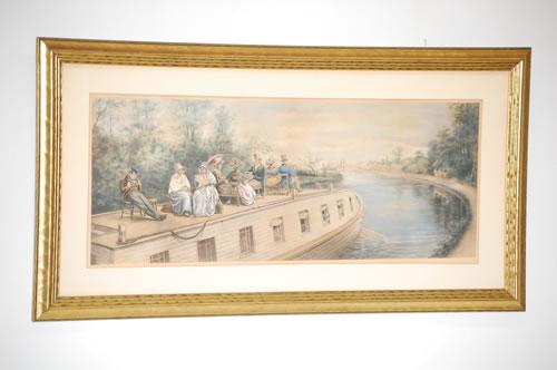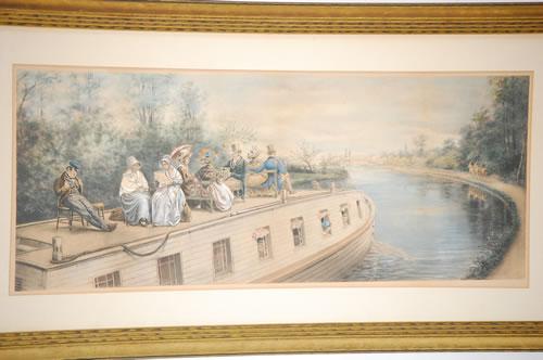 C. KLACKNER COLORED PRINT DEPICTING E.L. HENRY PAINTING OF A 19TH CENT. CANAL BARGE LOADED W/ FANCY PASSENGERS BEING TOWED BY HORSES-DATED 1900 IN A GILT MOLDED FRAME (14" X 35") - WEAR, TONING, STAIN, MISSING GLASS, IMPERFECTIONS