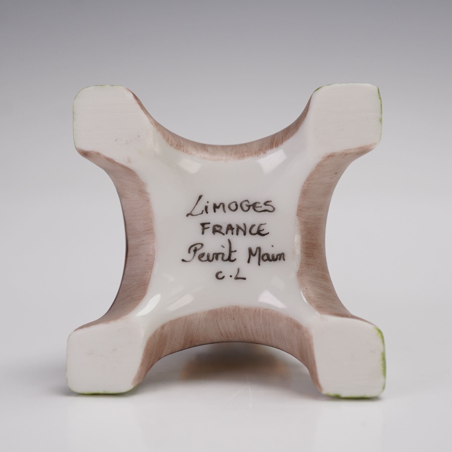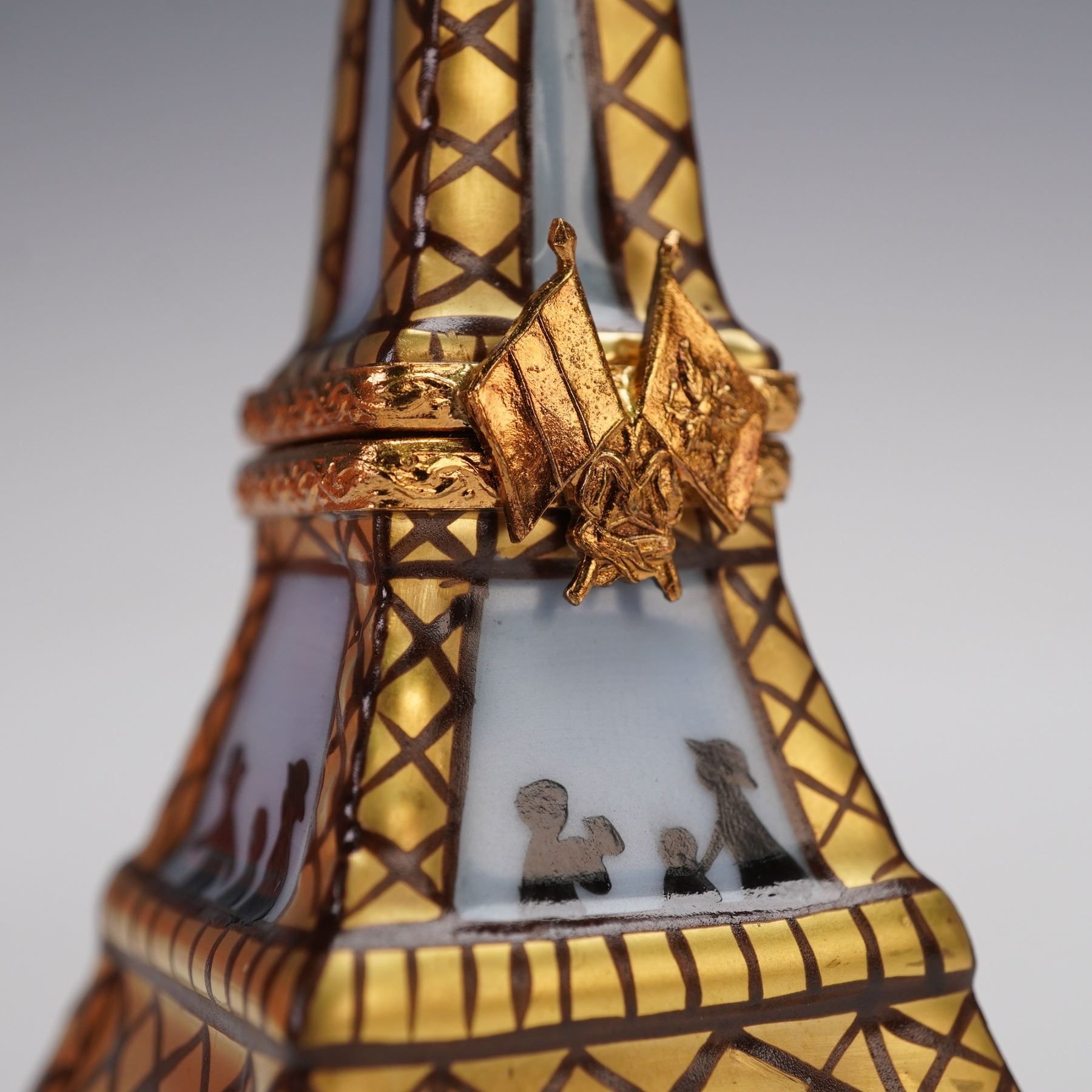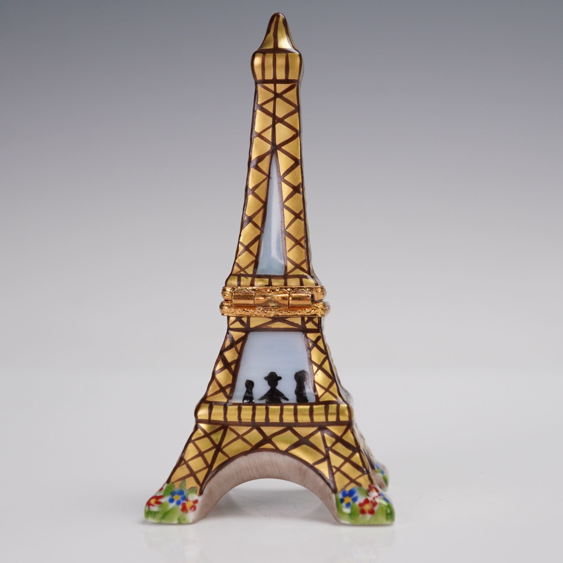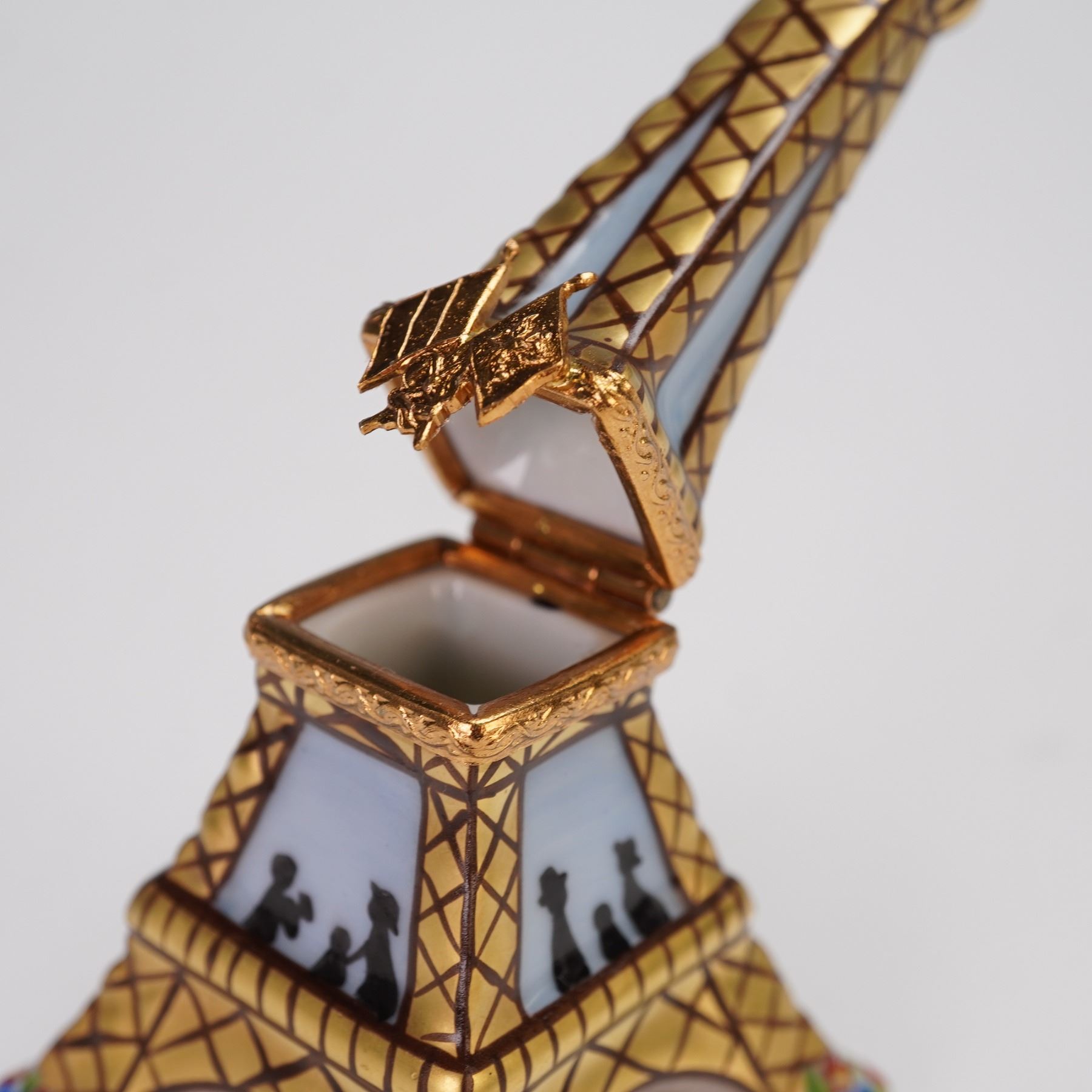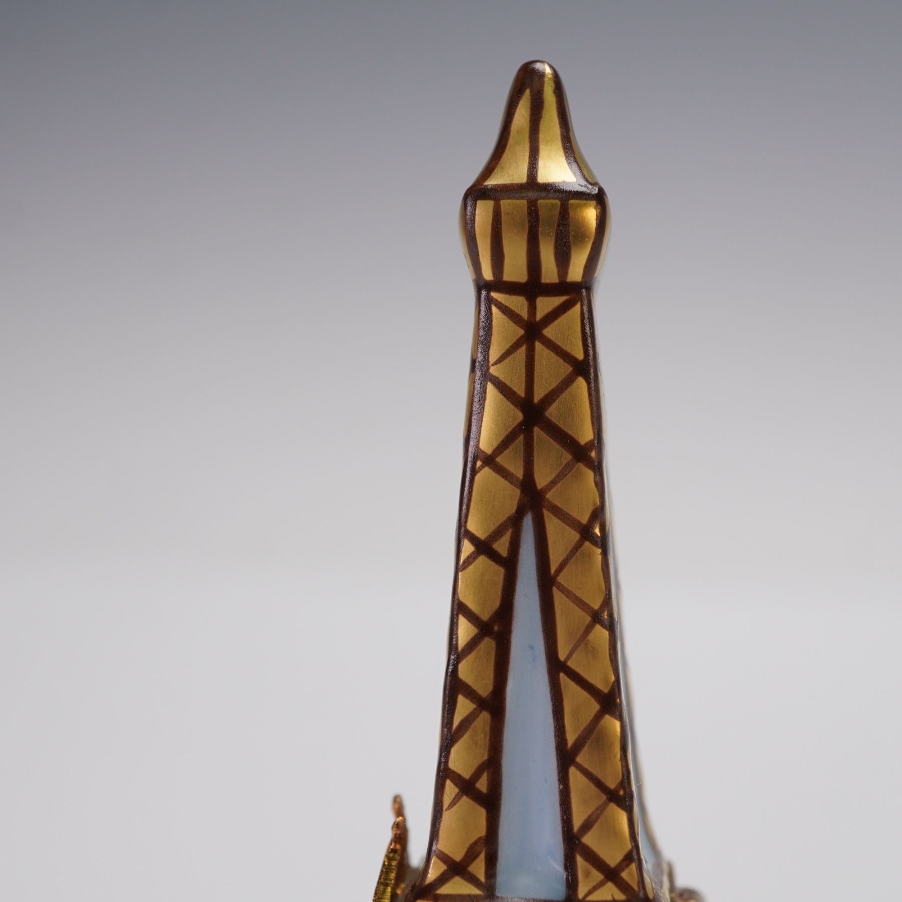 A hand-painted porcelain trinket box. Designed in the shape of the iconic Eiffel Tower, this hinged box features gilded lattice detailing, painted floral accents at the base, and silhouette figures in the windows. The piece opens at the middle to reveal a small interior compartment. Marked on the underside Limoges France Peint Main C.L.