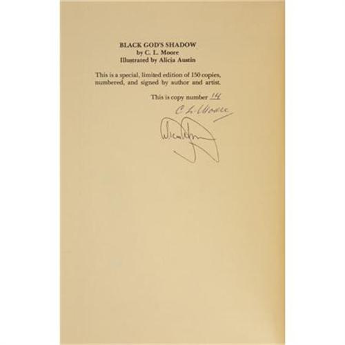 <B>C. L. Moore. Three First Editions</B></I>, <B>Two Signed</B></I>, including: <B><I>Judgment Night</B></I></B></I>. <I>A Selection of Science Fiction</B></I>. New York: Gnome Press Publishers, [1952]. First edition. Octavo. 344 pages. Publisher's blue cloth with red spine titles. In original pictorial dust jacket. Light edge wear to the boards. Dust jacket lightly rubbed on the panels, with minimal edge wear, else a very good copy. [and:] <B><I>Shambleau and Others</B></I></B></I>. New York: Gnome Press, Inc. Publishers, [1953]. First edition. Inscribed by the author on the title page. Octavo. 224 pages. Publisher's teal cloth with red spine titles. In original pictorial dust jacket. Moderate wear to the board edges, with bumped corners. Textblock edges mildly toned. Dust jacket lightly rubbed on the panels, with minor edge and corner wear. Overall, in very good condition. [and:] <B><I>Black God's Shadow</B></I></B></I>. West Kingston, Rhode Island: Donald M. Grant, Publisher, 1977. One of 150 special numbered, limited edition copies signed by the author and illustrator on the limitation page, and signed additionally by the publisher, Donald M. Grant on the title page. Octavo. 252 pages. Publisher's brown decorative cloth with dark brown spine titles. In original pictorial dust jacket. Housed in original illustrated box. A truly fine copy. <I>From the Robert and Diane Yaspan Collection.</B></I><BR><BR><b>Shipping:</b> Books & Catalogs (<a target="_blank" href="http://www.heritageauctions.com/common/shipping.php">view shipping information</a>)
