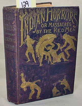 C. LATE 1800'S "INDIAN HORRORS OR MASSACRES BY THE RED MEN" HARDCOVER BOOK - A thrilling narrative of bloody wars with merciless and revengeful savages. A full account of the daring deeds and tragic death of Sitting Bull w/ startling descriptions of fantastic ghost dances, mysterious medicine men, desperate indian braves, scalping of helpless settlers, burning their homes, etc. The date is unreadable and the spine is loose but intact.