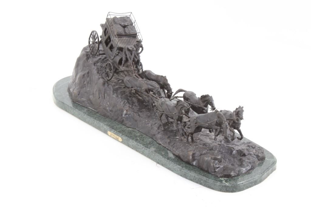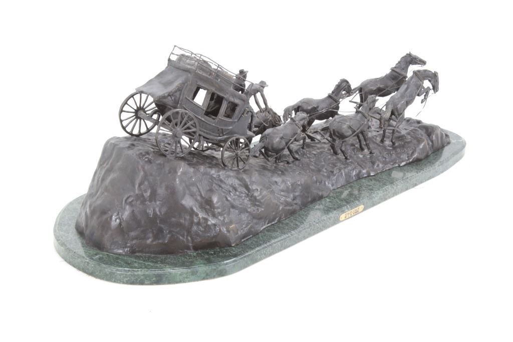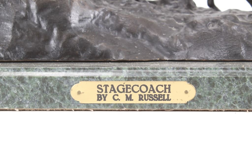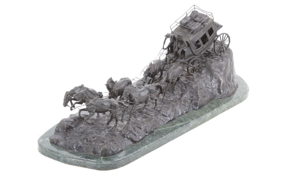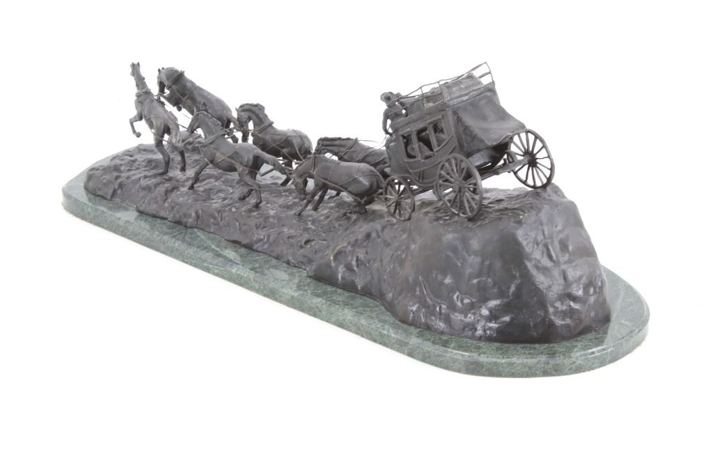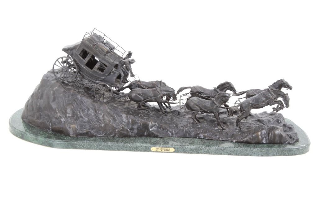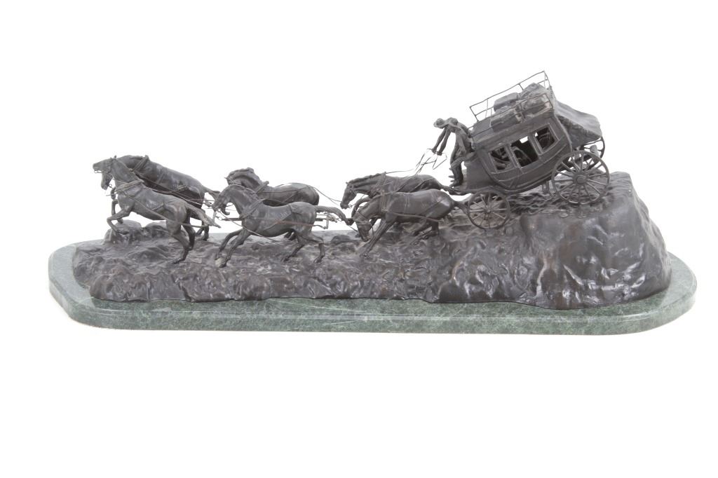 Featured in this lot is this bronze sculpture by C.M. Russell called "Stagecoach." This truly is a beautiful bronze sculpture depicting the stagecoach driver and his team of horses pulling a stagecoach down the steep embankment. Exquisite details show the strength and stamina of the team of horses, while the driver's face aptly shows his level of concentration. Charles Marion Russell, also known as C. M. Russell, Charlie Russell, and "Kid" Russell, was an American artist of the American Old West. He created more than 2,000 paintings of cowboys, Native Americans, and landscapes set in the western United States and in Alberta, Canada, in addition to bronze sculptures. The condition of this bronze is good with no obvious signs of damage and in good overall condition. The measurements of this bronze are 16" x 45 1/2" x 17".