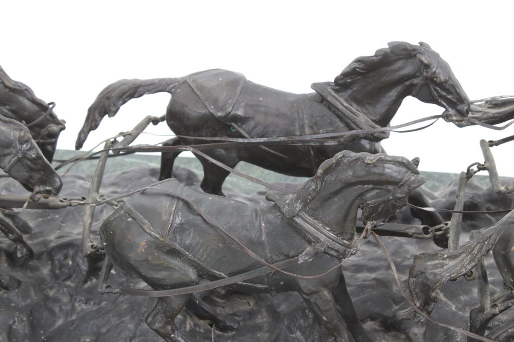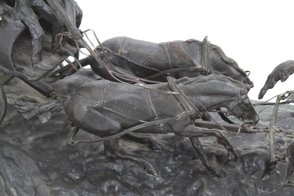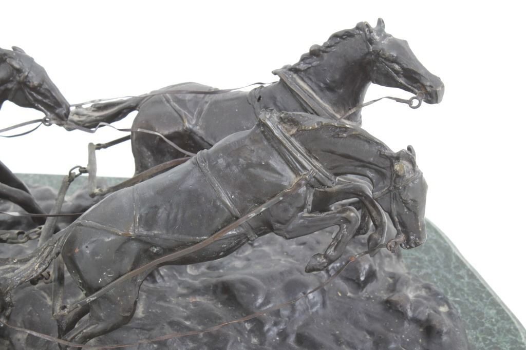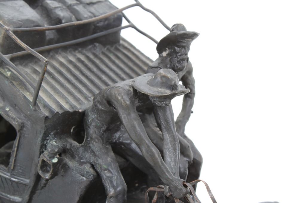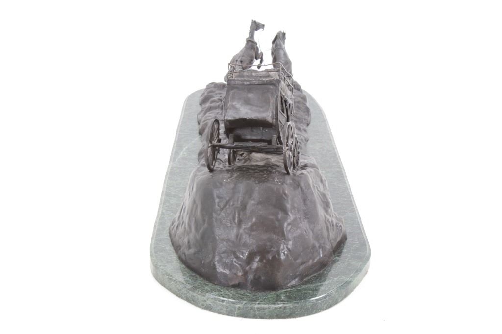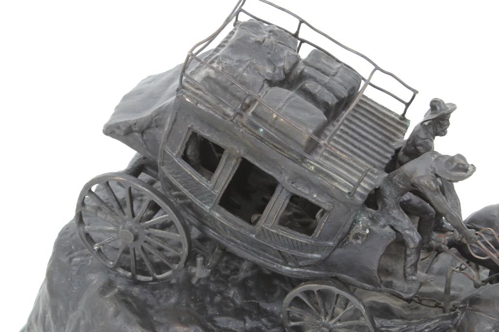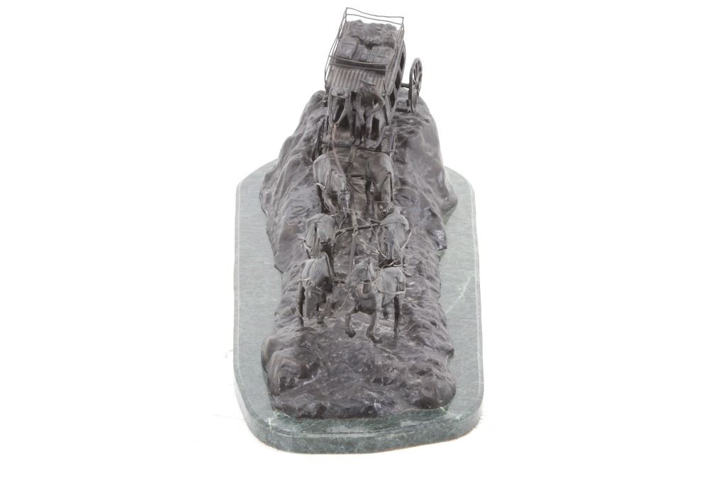 Featured in this lot is this bronze sculpture by C.M. Russell called "Stagecoach." This truly is a beautiful bronze sculpture depicting the stagecoach driver and his team of horses pulling a stagecoach down the steep embankment. Exquisite details show the strength and stamina of the team of horses, while the driver's face aptly shows his level of concentration. Charles Marion Russell, also known as C. M. Russell, Charlie Russell, and "Kid" Russell, was an American artist of the American Old West. He created more than 2,000 paintings of cowboys, Native Americans, and landscapes set in the western United States and in Alberta, Canada, in addition to bronze sculptures. The condition of this bronze is good with no obvious signs of damage and in good overall condition. The measurements of this bronze are 16" x 45 1/2" x 17".