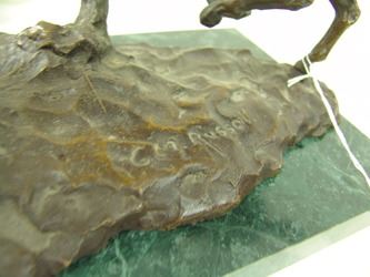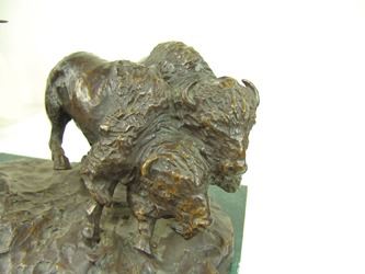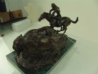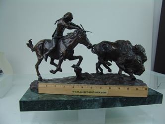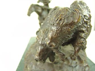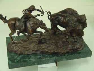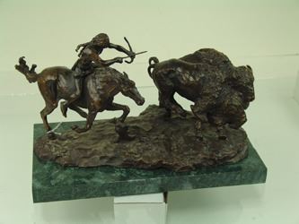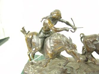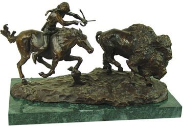 Famous, signed bronze sculpture "Buffalo Hunt" or "Buffalo Runner", showing a mounted bow hunter in action. Good condition, small repair on jade marble base. Mid 1900s. 9-1/2" x 17" x 8"