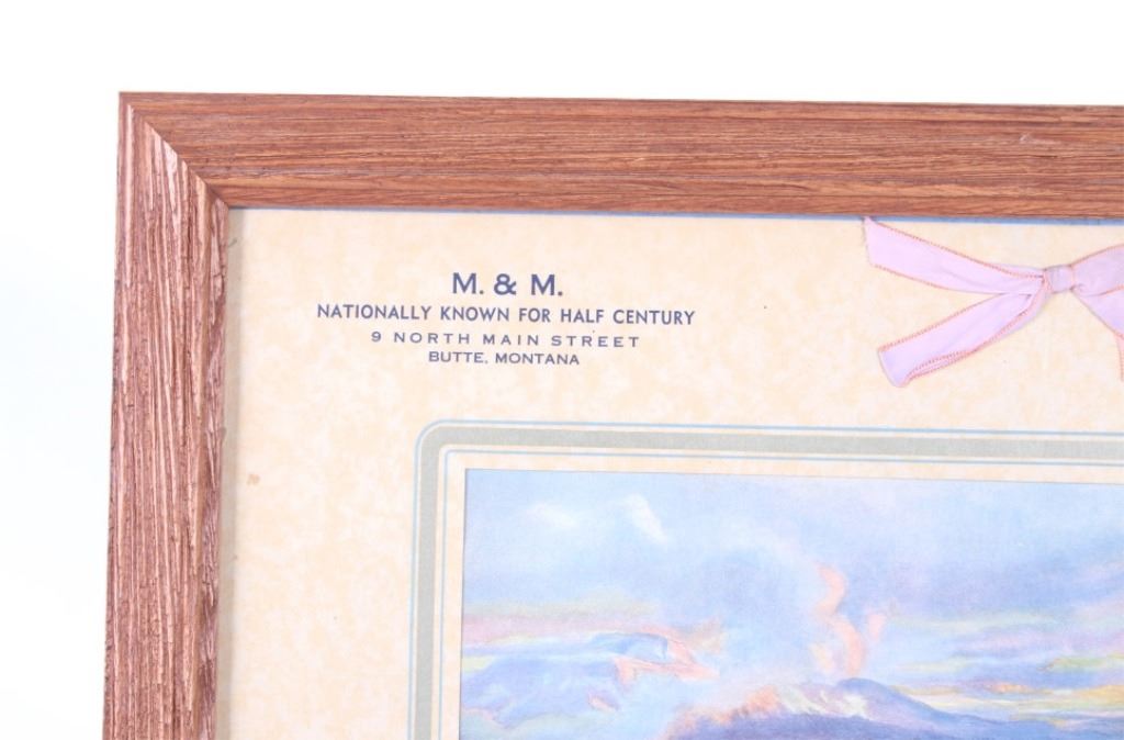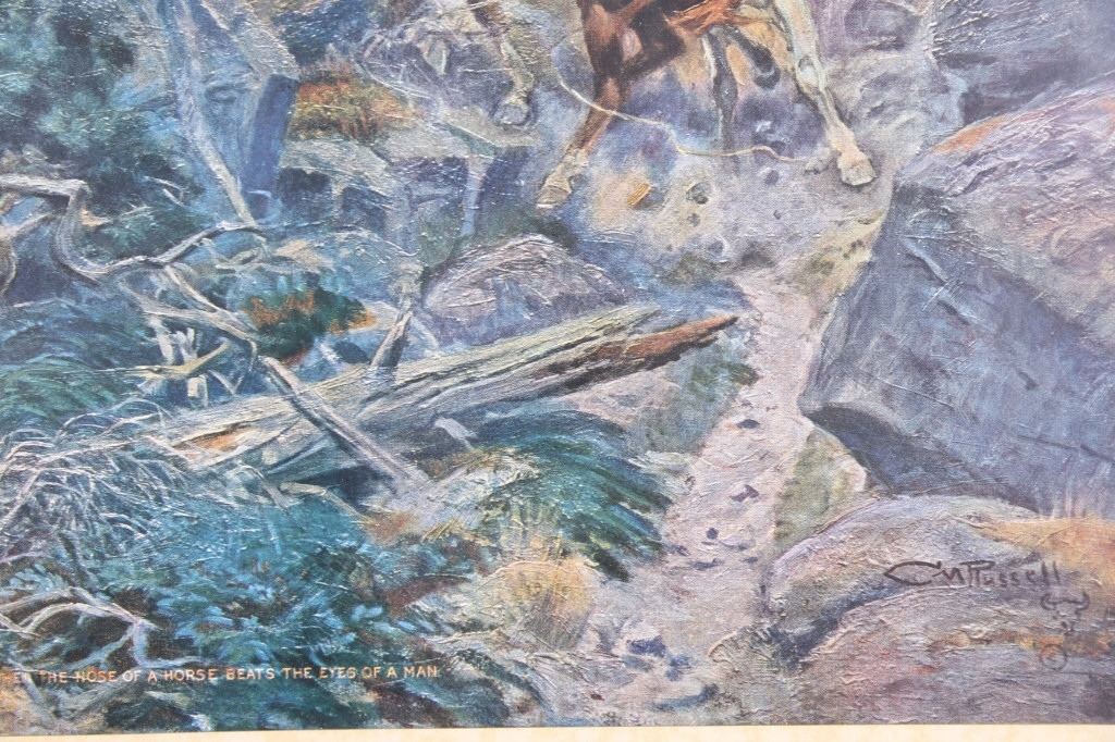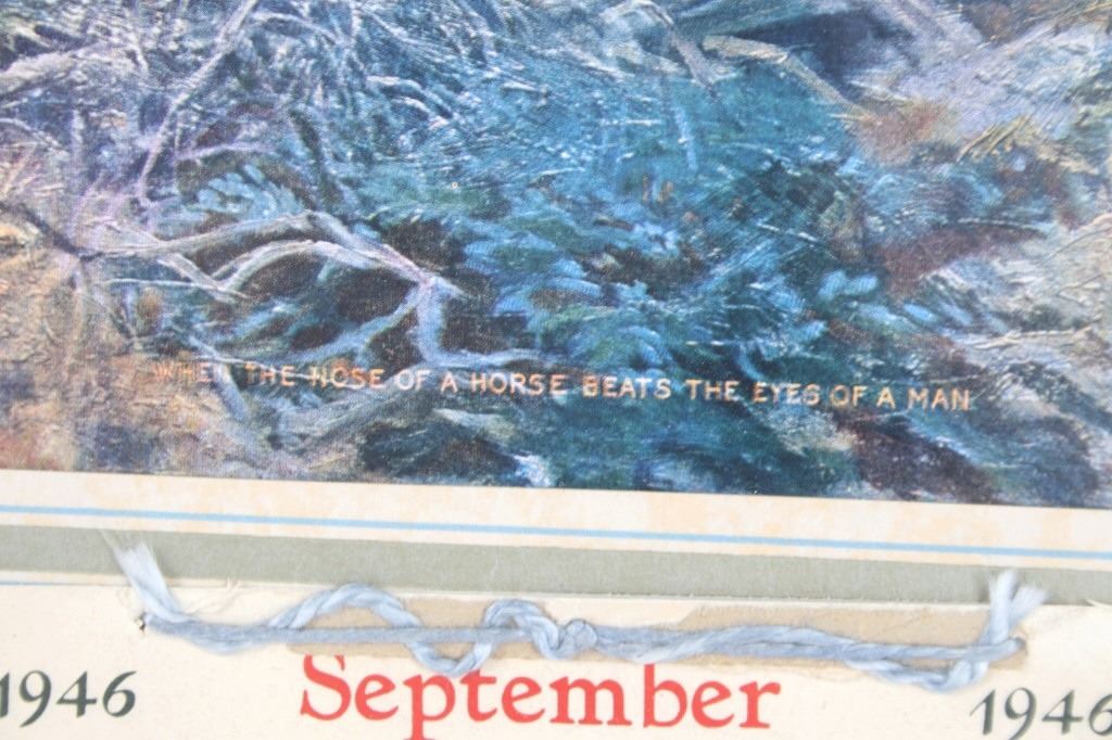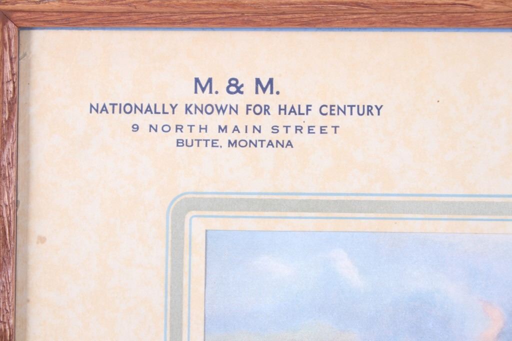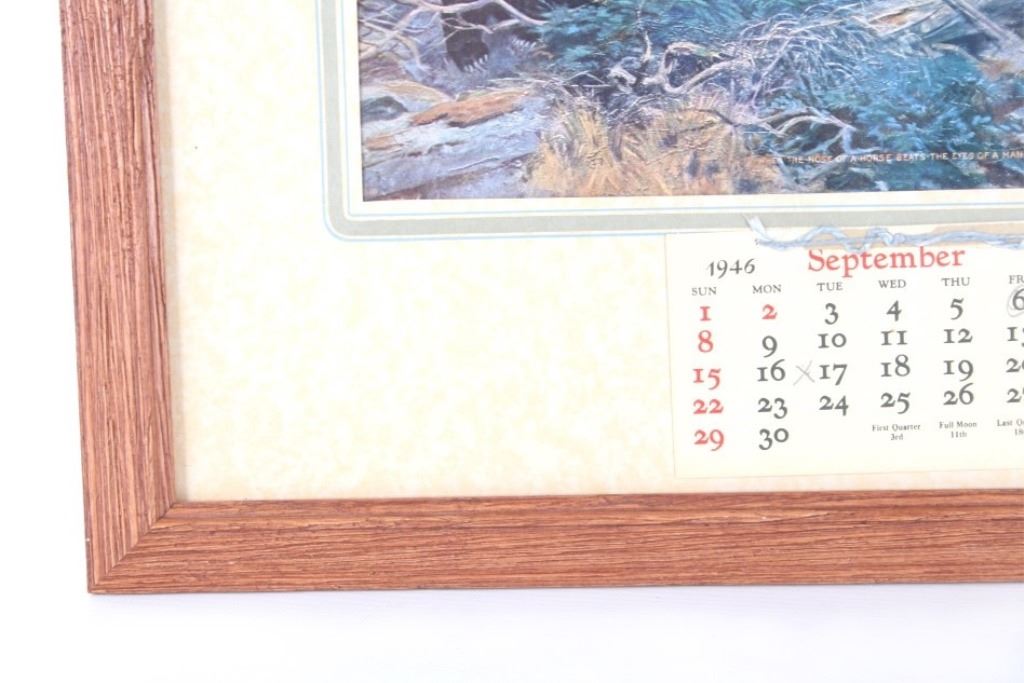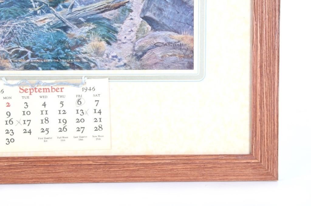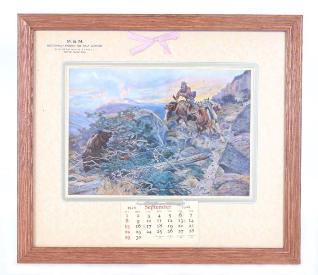 Featured in this lot we have a framed C M Russell painting calendar from 1946. Charles Marion Russell, born March 19th, 1864 in St. Louis Missouri and died on October 24, 1926 in Great Falls Montana. Russell is known for his paintings of cowboys, Indians, and western landscapes, as well as crafting bronze sculptures. This piece shows the C M Russell painting "When the Nose of a Horse Beats the Eyes of a Man", depicting a frontiersman getting diverted by his horse, due to a bear behind the bend. The calendar serves as advertising for "M. & M." out of Butte, Montana. The calendar was for the year 1946. Overall, the piece shows very good condition, showing minimal edge wear to the top left. The calendar and print are behind glass and framed in a wooden frame. The calendar piece measures 18" L x 20 3/4" W.