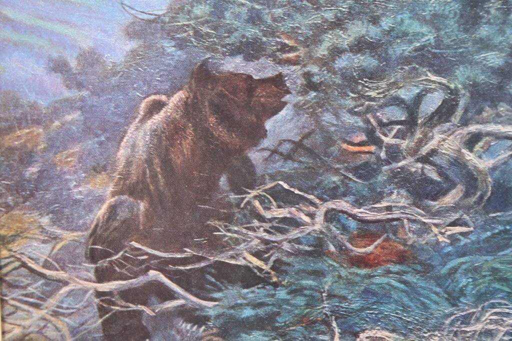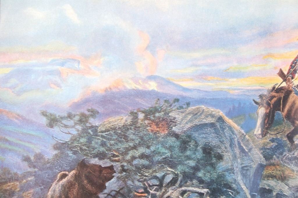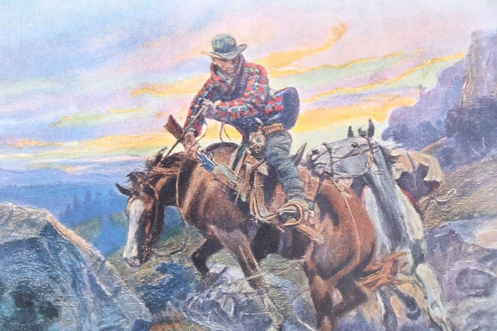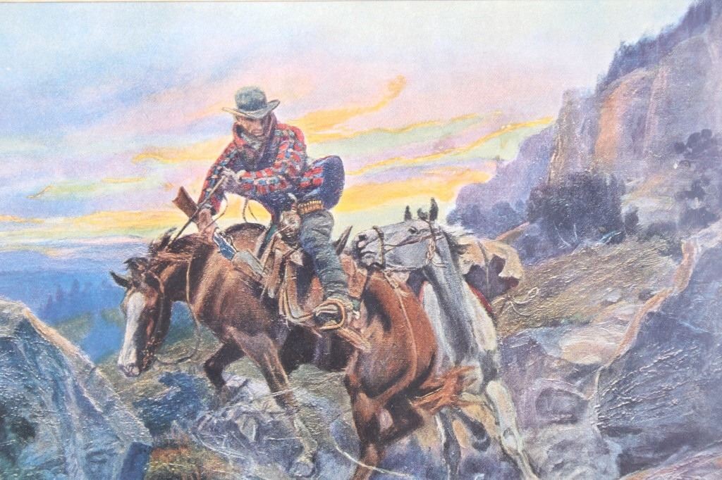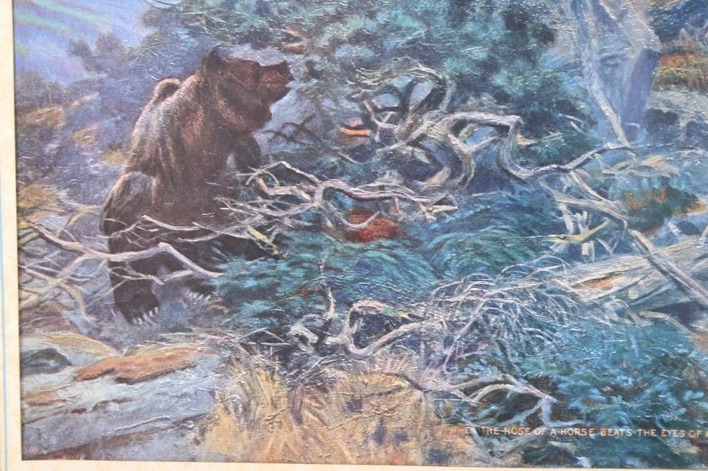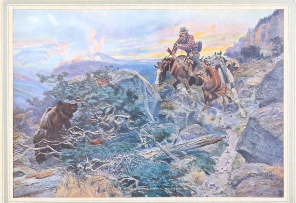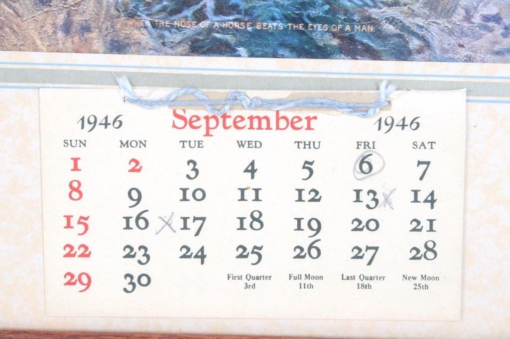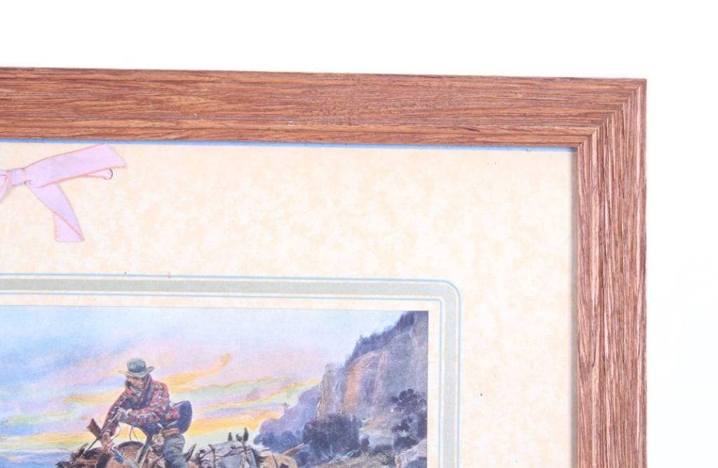 Featured in this lot we have a framed C M Russell painting calendar from 1946. Charles Marion Russell, born March 19th, 1864 in St. Louis Missouri and died on October 24, 1926 in Great Falls Montana. Russell is known for his paintings of cowboys, Indians, and western landscapes, as well as crafting bronze sculptures. This piece shows the C M Russell painting "When the Nose of a Horse Beats the Eyes of a Man", depicting a frontiersman getting diverted by his horse, due to a bear behind the bend. The calendar serves as advertising for "M. & M." out of Butte, Montana. The calendar was for the year 1946. Overall, the piece shows very good condition, showing minimal edge wear to the top left. The calendar and print are behind glass and framed in a wooden frame. The calendar piece measures 18" L x 20 3/4" W.