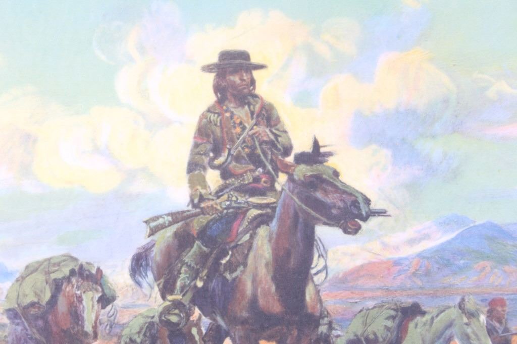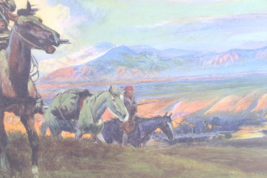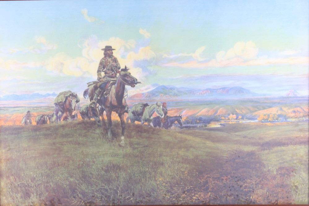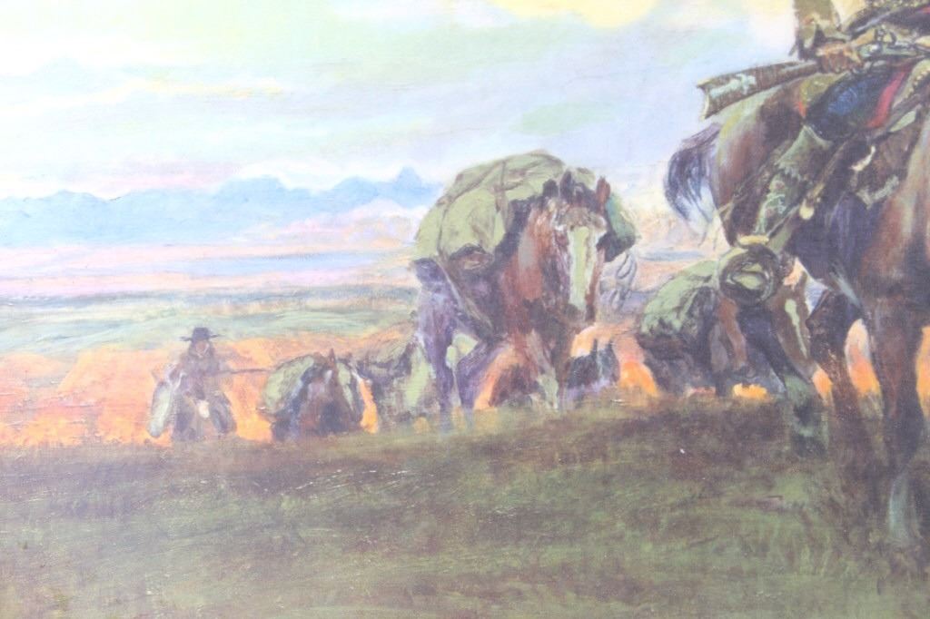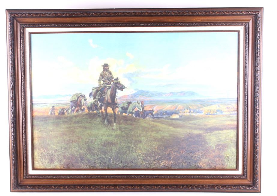Featured in this lot is this framed chromolithograph of a caravan traversing the open high plains by Montana artist C. M Russell. The piece is signed and dated in the lower left, “CM Russell (Buffalo Skull) 1918 in the plate. The scene features a caravan of men riding horses with pack horses in tow and shows the rich western decorum that Russell was so well known for. This original chromolithograph was completed during the lifetime during the lifetime of Charles Marion Russell. C.M. Russell is Montana’s finest artist and the most renowned and well-known cowboy artist of the 19th and 20th Century. These chromolithographs are the closest original piece to a true painting and are increasingly rare with only one The Custer Fight being offered on the public market which sold for $6,000 at Santa Fe Art Auction (shown w/ premiums). The piece has been professionally framed showing a wonderful solid wood antique frame that shows beautifully tooled decoration with a slightly floral feel. The condition of this framed chromolithograph is good with no obvious signs of damage and in good overall condition. The measurements of this framed chromolithograph are 32" x 44" and the visible art measures 23 1/2" x 35 1/2".