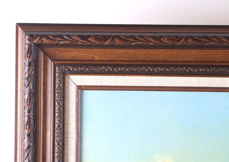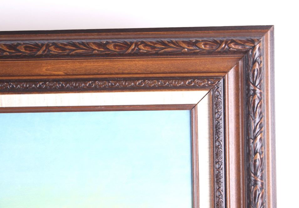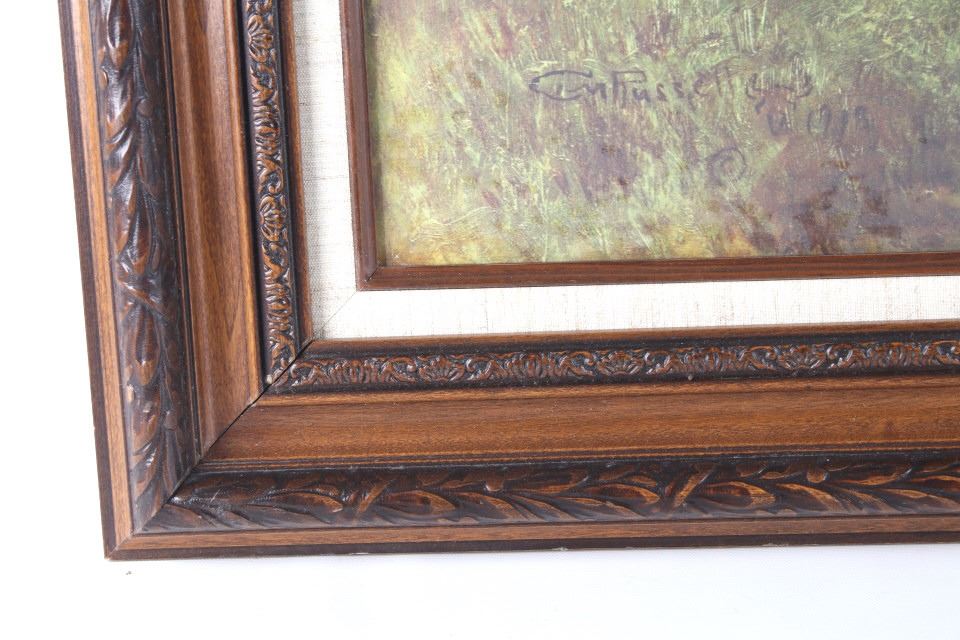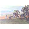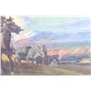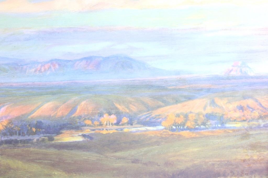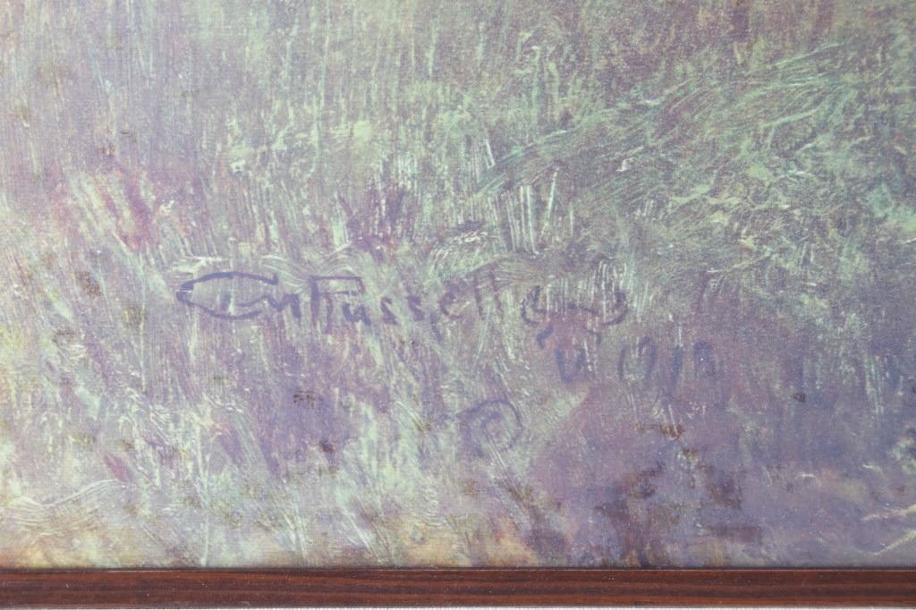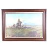Featured in this lot is this framed chromolithograph of a caravan traversing the open high plains by Montana artist C. M Russell. The piece is signed and dated in the lower left, “CM Russell (Buffalo Skull) 1918 in the plate. The scene features a caravan of men riding horses with pack horses in tow and shows the rich western decorum that Russell was so well known for. This original chromolithograph was completed during the lifetime during the lifetime of Charles Marion Russell. C.M. Russell is Montana’s finest artist and the most renowned and well-known cowboy artist of the 19th and 20th Century. These chromolithographs are the closest original piece to a true painting and are increasingly rare with only one The Custer Fight being offered on the public market which sold for $6,000 at Santa Fe Art Auction (shown w/ premiums). The piece has been professionally framed showing a wonderful solid wood antique frame that shows beautifully tooled decoration with a slightly floral feel. The condition of this framed chromolithograph is good with no obvious signs of damage and in good overall condition. The measurements of this framed chromolithograph are 32" x 44" and the visible art measures 23 1/2" x 35 1/2".