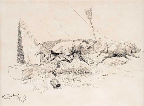 C.M. Russell (1864-1926). 8" x 10". Pen & Ink Drawing. "Pard in Slippers and Pajamas Hastened to Investigate". Fine condition. (est $20,000-30,000). Pictured on page 642 in the book "Fifteen Thousand Miles By Stage" by Carrie Adell Strahorn.