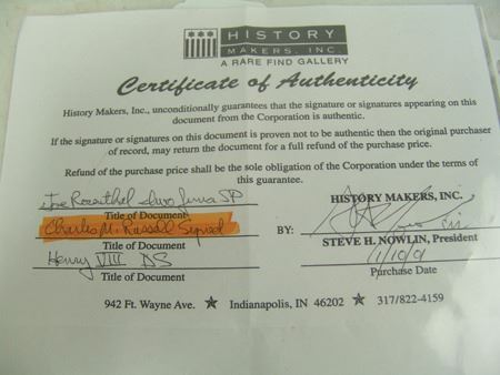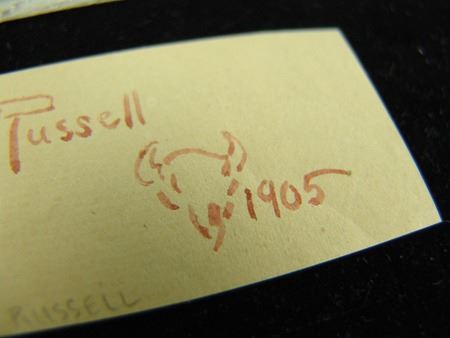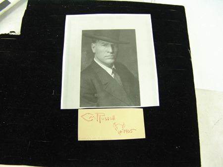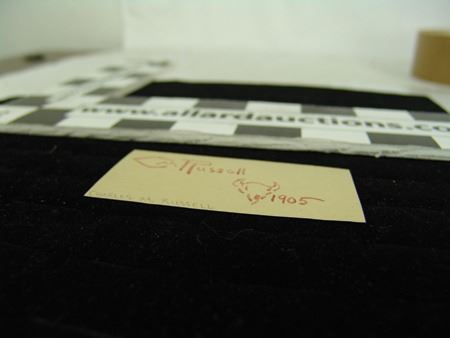 Ca. 1905, Clipping from a personal letter or document with the famous C.M. Russell signature that includes a buffalo skull and "1905." With COA from History Makers, Inc., Indianapolis. 1-1/2" x 3"