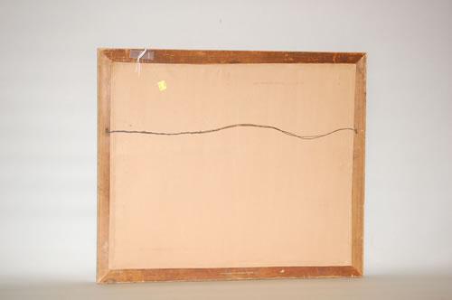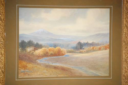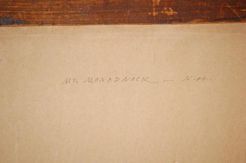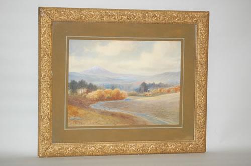 C. MYRON CLARK WATERCOLOR PAINTING - NEW ENGLAND MOUNTAIN LANDSCAPE W/ STREAM & COTTAGE-TITLED ON BACK "MT. MONADNOCK NH" & SIGNED C. MYRON CLARK ON LOWER LEFT, MATTED IN A PRESS MOLDED FRAME (12 1/2" X 16 1/2") - MINOR LOSSES TO FRAME