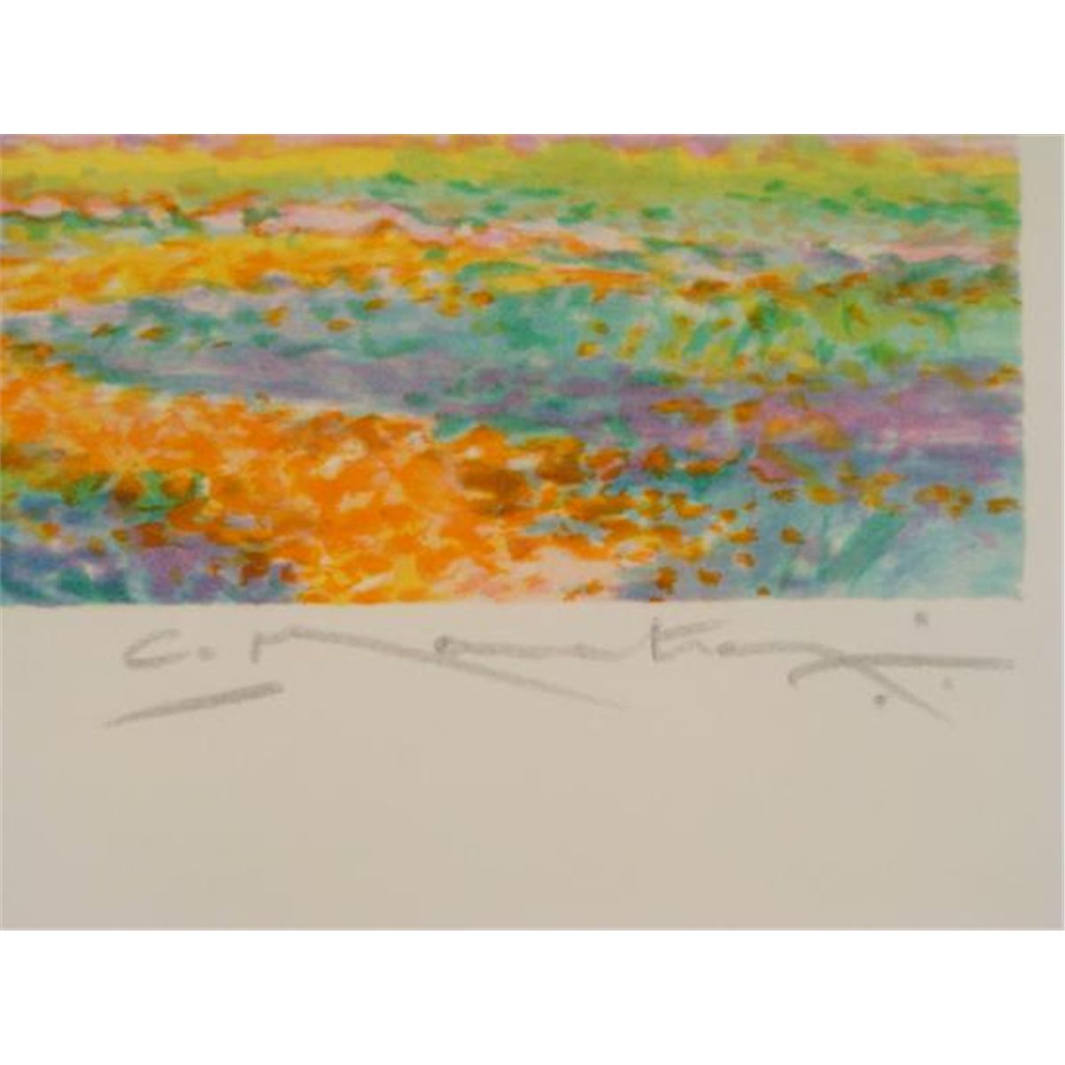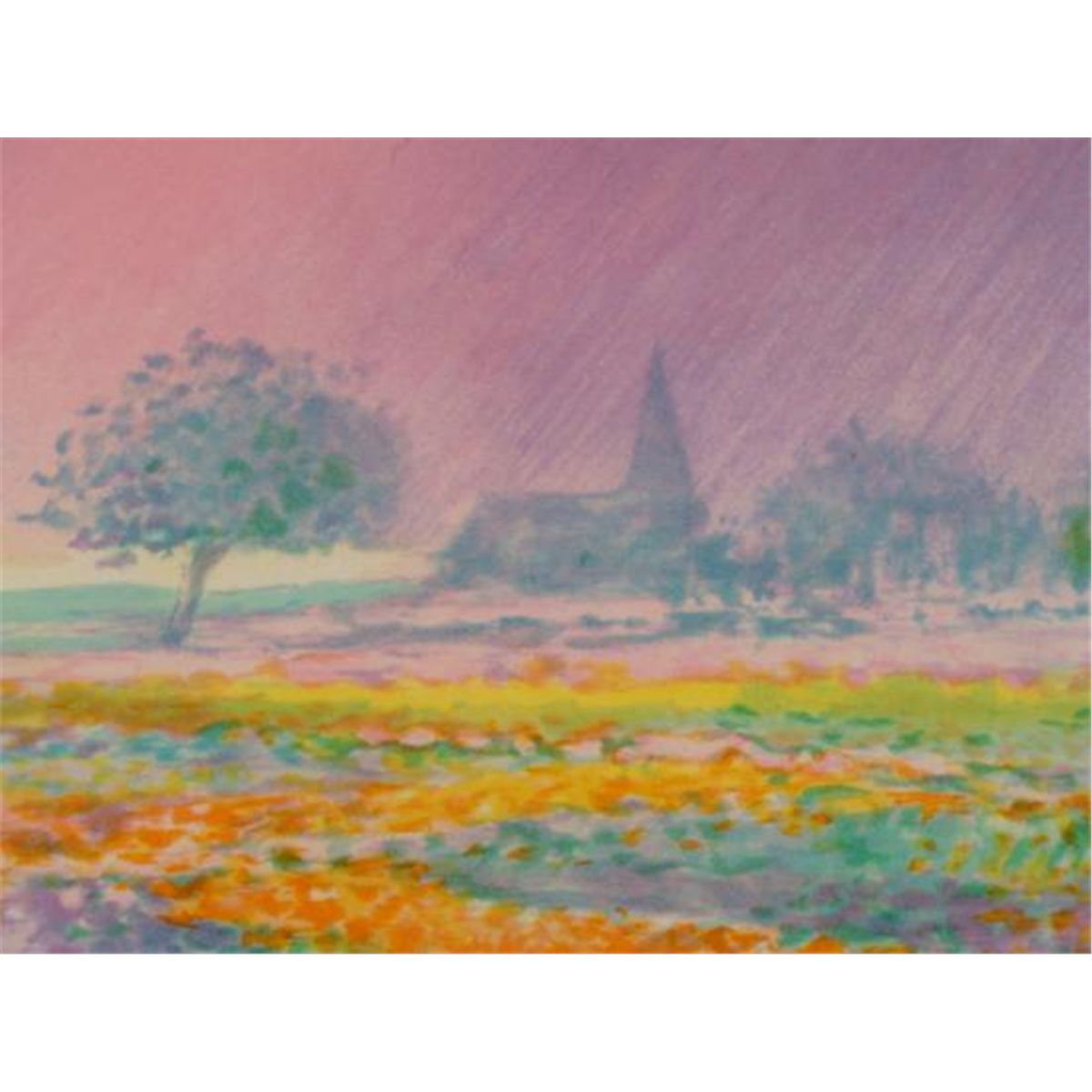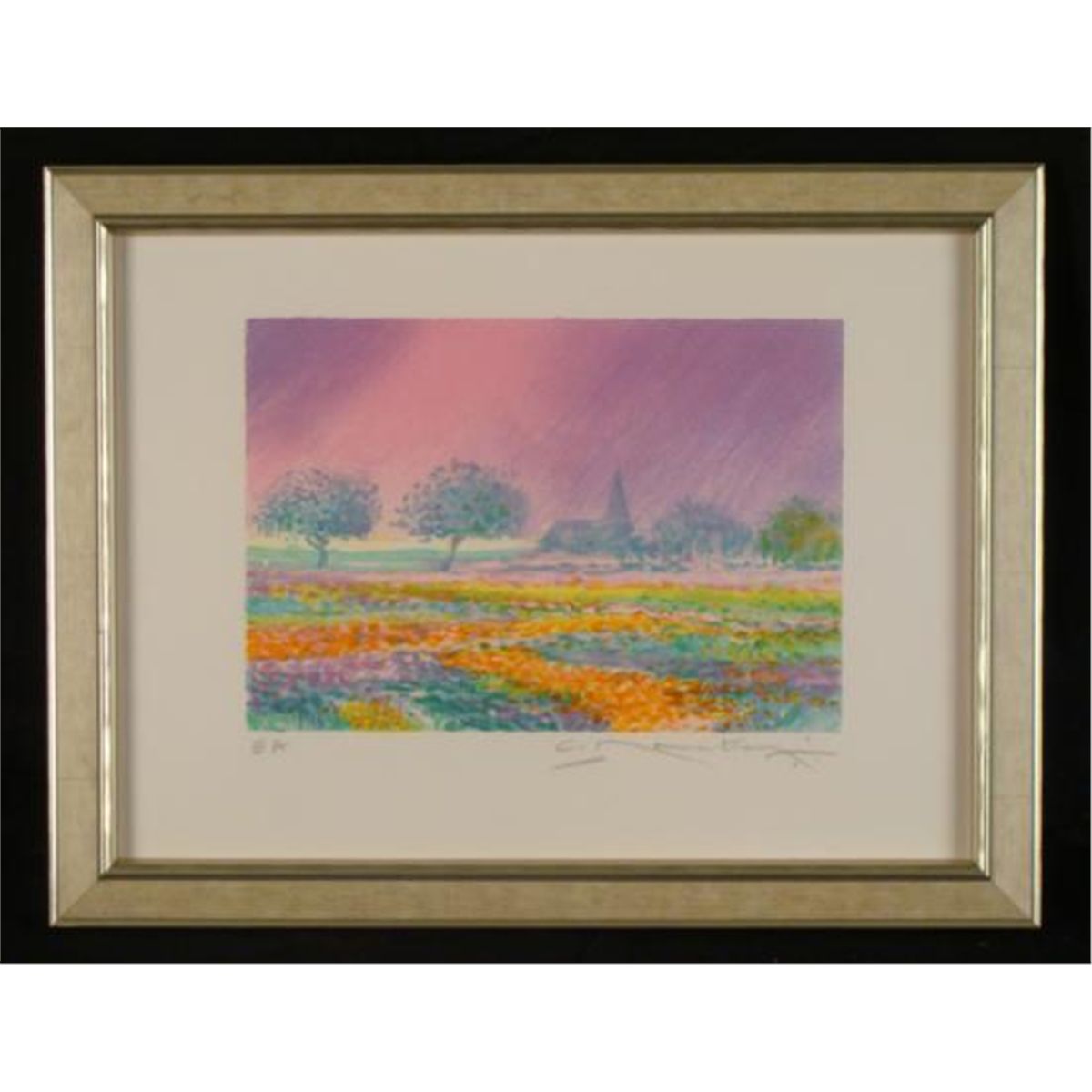 This is a limited edition print by an Armenian artist formerly of the USSR. The scene is a country field, with church in the background. The colors and brushstrokes are inspired by the Impressionists, with a bright intensity. Artist: C. Manoukian Title: "Claude les Deux Arbes" Medium: Lithograph print on paper Signature: By the artist in pencil, lower right Edition: Artist's proof, marked E.A., lower left Year: 1994 Image size: 8 x 10 inches Frame size: 13 x 17 inches Framing: Pale gold laminate wood frame Condition: Excellent This is a lovely piece by a talented Armenian artist. *