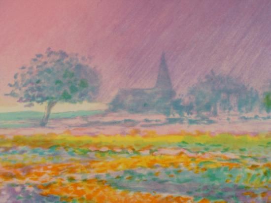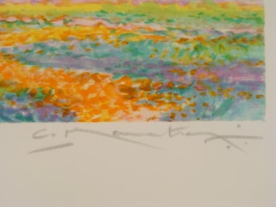 This is a limited edition print by an Armenian artist formerly of the USSR. The scene is a country field, with church in the background. The colors and brushstrokes are inspired by the Impressionists, with a bright intensity. Artist: C. Manoukian Title: "Claude les Deux Arbes" Medium: Lithograph print on paper Signature: By the artist in pencil, lower right Edition: Artist's proof, marked E.A., lower left Year: 1994 Image size: 8 x 10 inches Frame size: 13 x 17 inches Framing: Pale gold laminate wood frame Condition: Excellent This is a lovely piece by a talented Armenian artist. *