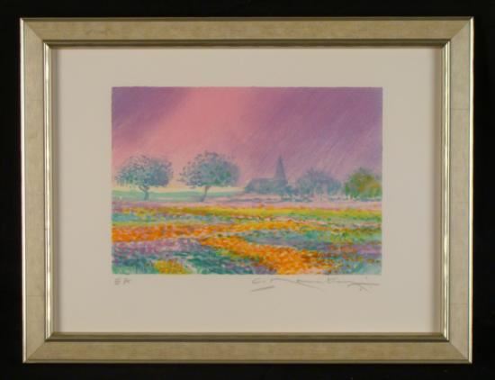 This is a limited edition print by an Armenian artist formerly of the USSR. The scene is a country field, with church in the background. The colors and brushstrokes are inspired by the Impressionists, with a bright intensity. Artist: C. Manoukian Title: "Claude les Deux Arbes" Medium: Lithograph print on paper Signature: By the artist in pencil, lower right Edition: Artist's proof, marked E.A., lower left Year: 1994 Image size: 8 x 10 inches Frame size: 13 x 17 inches Framing: Pale gold laminate wood frame Condition: Excellent This is a lovely piece by a talented Armenian artist.