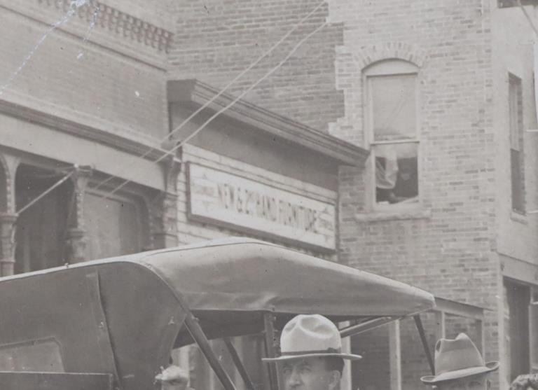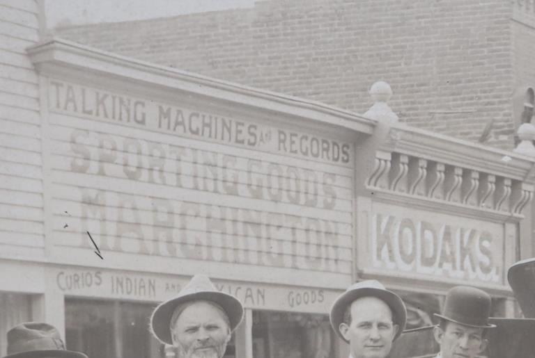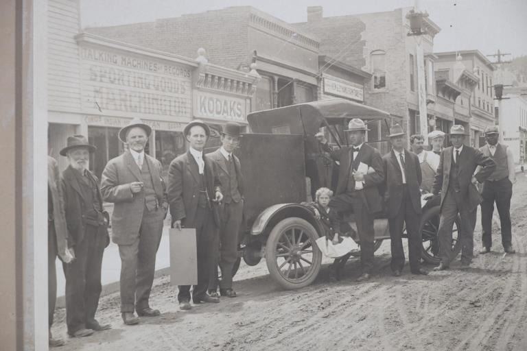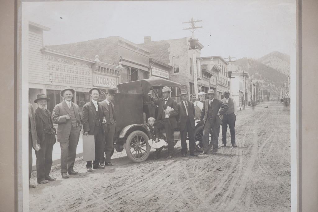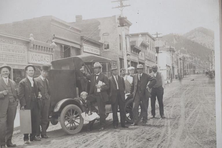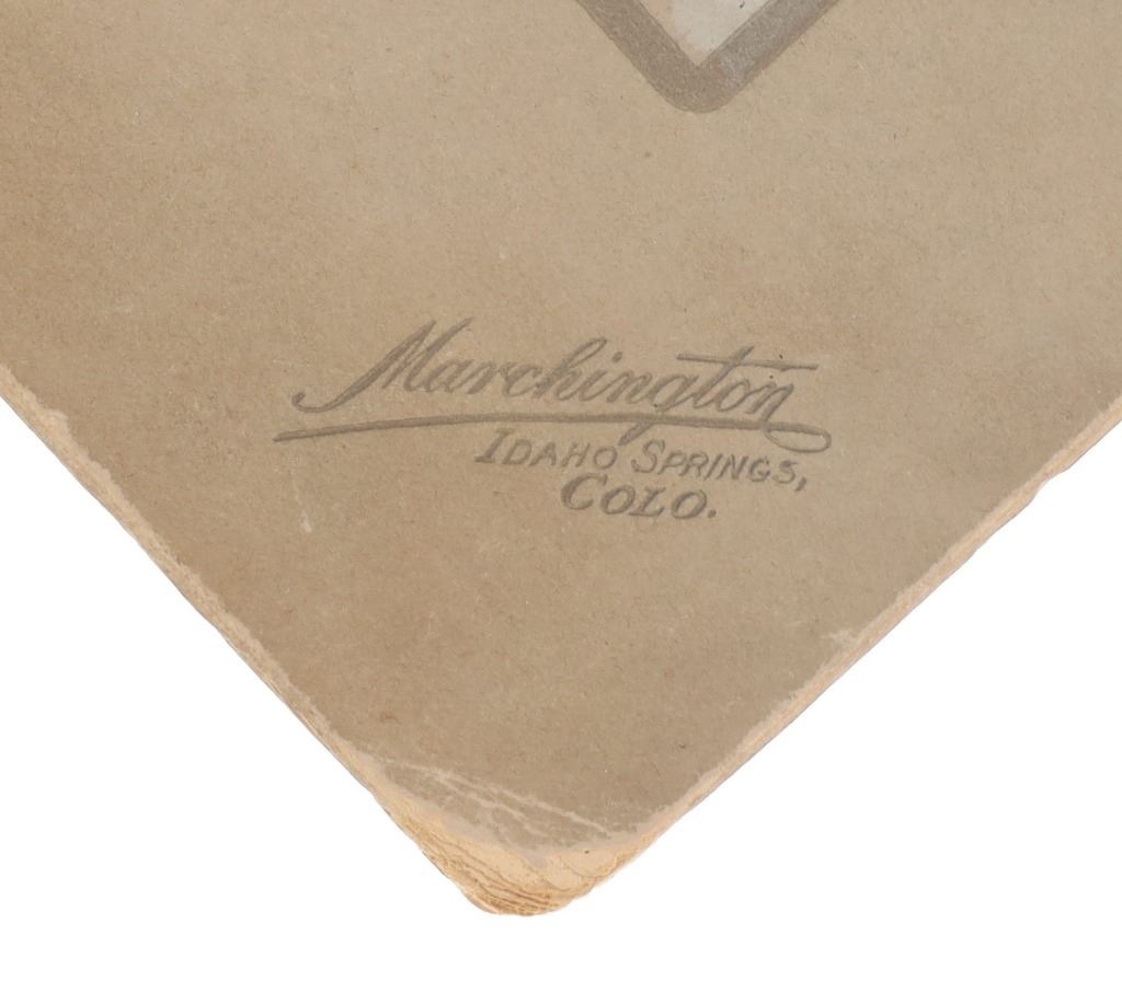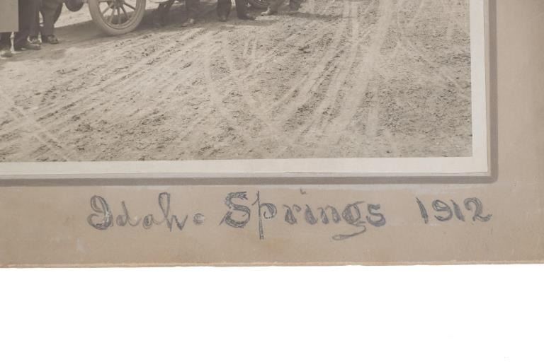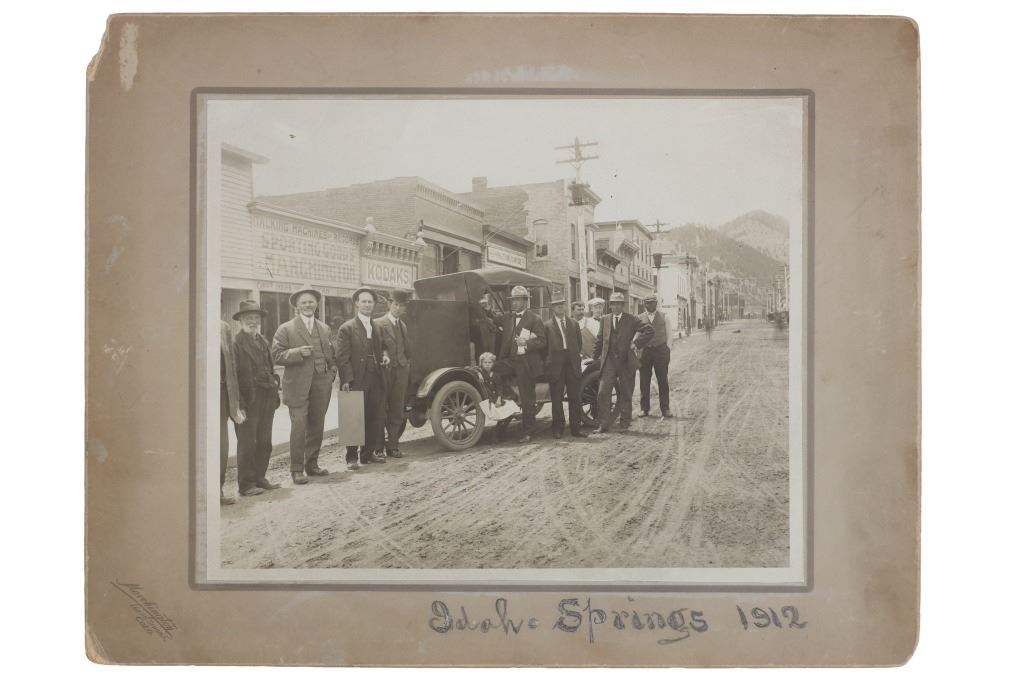 For your consideration is this large format, original photo of a group of men in Idaho Springs, Colorado taken by Clarence Marchington in 1912. Clarence Marchington (1875–1963) was a photographer based in Idaho Springs, Colorado, active in the early 1900s. After training at the Guerin College of Photography in St. Louis with his wife Emma, he opened a studio in 1902 on Miner Street. Marchington became known for portraits, baby contests, mining scenes, and scenic postcards—many hand-painted. His work captured daily life and industry in the region and was regularly featured in the Idaho Springs News. Nearly 800 of his photos are now preserved in the History Colorado collection. This photo shows a group of men standing next to a car, likely a Ford Model T, in the middle of the dirt road in Idaho Springs, Colorado in 1912. A young girl sits on the back left wheel well and looks towards the photographer. Various businesses can be seen in the background. The photo is marked on the bottom reading, "Marchington Idaho Springs, Colo. / Idaho Springs 1912". The piece shows good condition overall with slight wear present from its age and use over the years, but no major signs of damage is noted. The visible photo measures 7 7/8" L x 9 3/4" W, while the entire piece measures 10 3/4" L x 13 5/8" W. It weighs under 6 ounces.