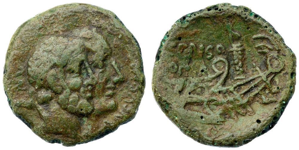 Rome. NV[MA · POMPILI ·] ANCVS [· MARCI], jugate heads of Numa Pompilius and Ancus Marcius, to right. Reverse: [C ·] CENSO above, [ROMA] to left, two ships crossing; behind, spiral column bearing statue of Victory. Crawford 346/4a; BMCRR 2415; RBW 1321; Sydenham 715. Green patina. Very Fine. The moneyer responsible for this interesting As depicting the heads of the early Roman kings Numa Pompilius and Ancus Marcius on the obverse was a Marian legate who died in 82 BC while fighting in the final battle with Sulla. The head of King Ancus Marcus alludes to the descent of the moneyer's gens, Marcia, from him, and thus also to his grandfather the earlier king, Numa Pompilius, a reference Crawford calls "geneological fiction" (p. 361).The reverse is also quite interesting as being the first numismatic depiction of Rome's port, Ostia, which was reputedly founded by Ancus Marcius, and shows a ship as well as a victory column, perhaps that commemorating the victory of C. Marcius Rutilus, an ancestor of the moneyer who was Dictator in 356 as well as having been elected Consul four times.