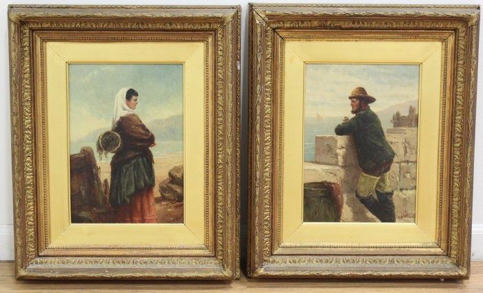 Pair oils on canvas. Signed lower right. Approx. 14" H x 10" W unframed, 23" H x 19" W framed.