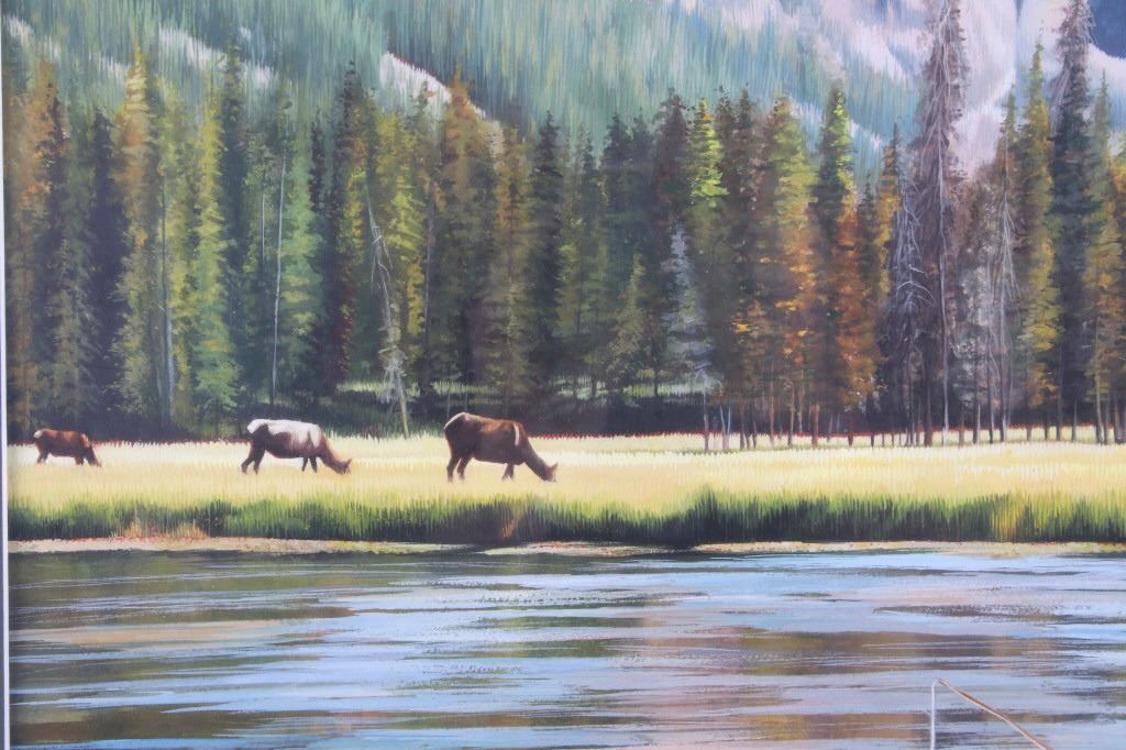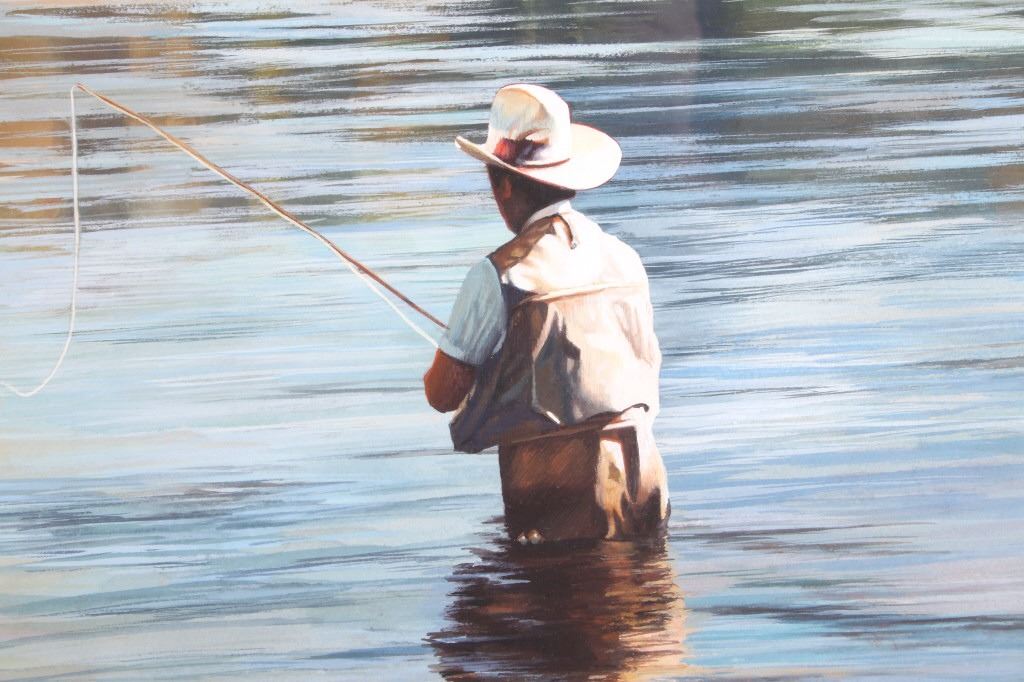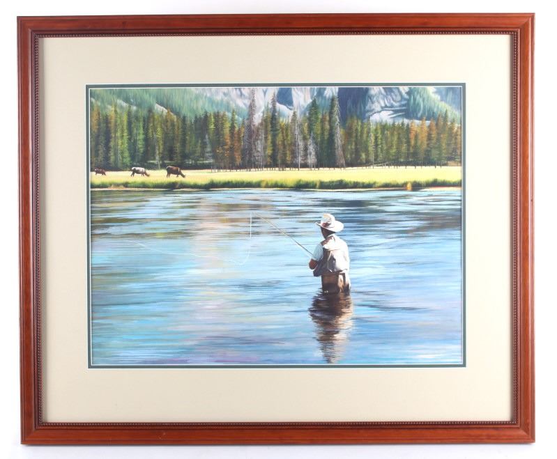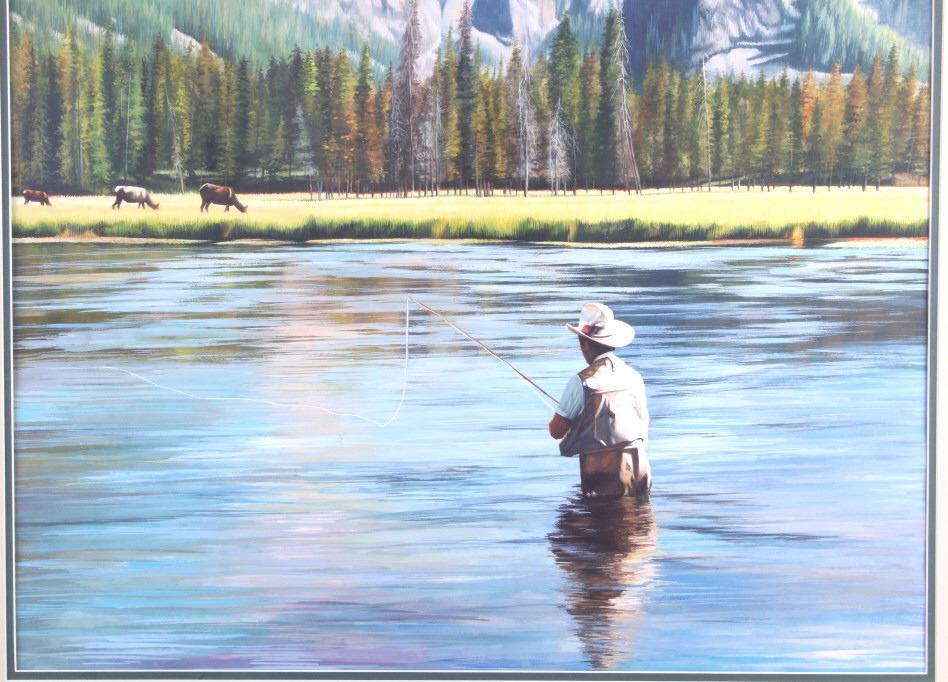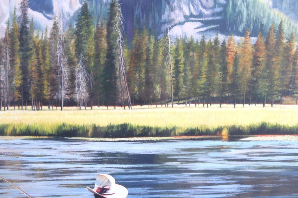 Offered in this lot is a wonderful, circa mid 1900's, large, original painting of a man fishing the Snake River with the Tetons and elk in the background. The painting features a man seen from behind, in waders and a straw cowboy hat, fly-fishing in what is believed to be the snake river. On the far bank are three cow-elk eating in a meadow. Beyond the meadow is timber with Tamarack/Larch just starting to turn golden. Behind the timber is the base of the Tetons just starting. This painting has been professionally double matted and framed. Unfortunately, if there is an artist mark or signature, it is covered by the matting. The lack of seen artist signature does not lessen the impressiveness of this painting. The seen art measures 24" x 18" and the frame measures 33" x 27 ½”. This item is in very good condition, showing no obvious signs of damage.