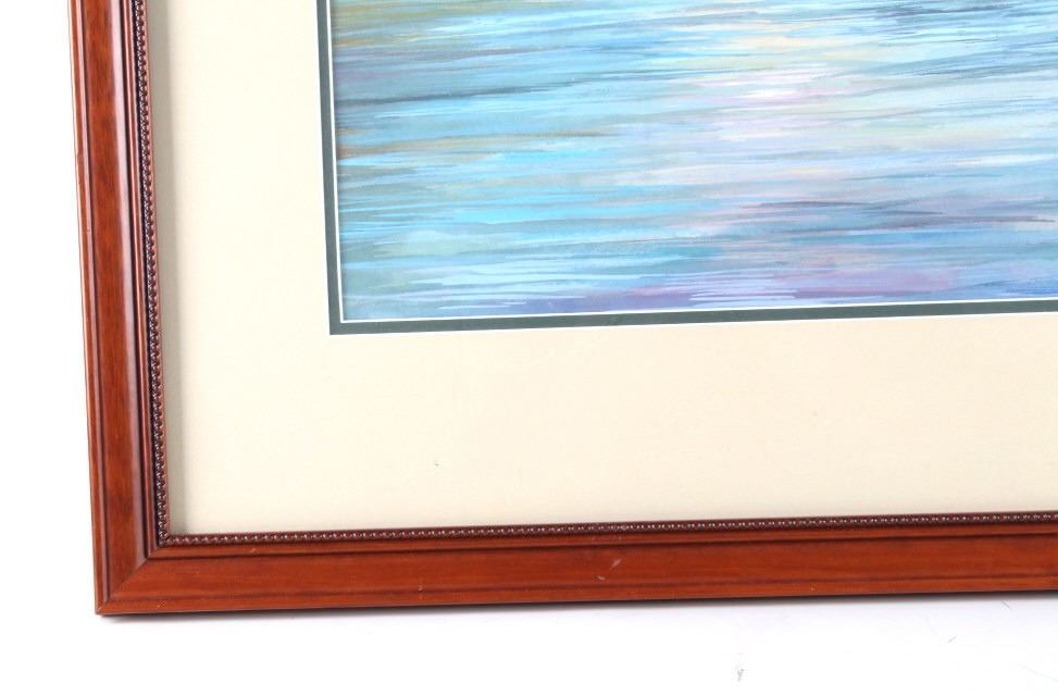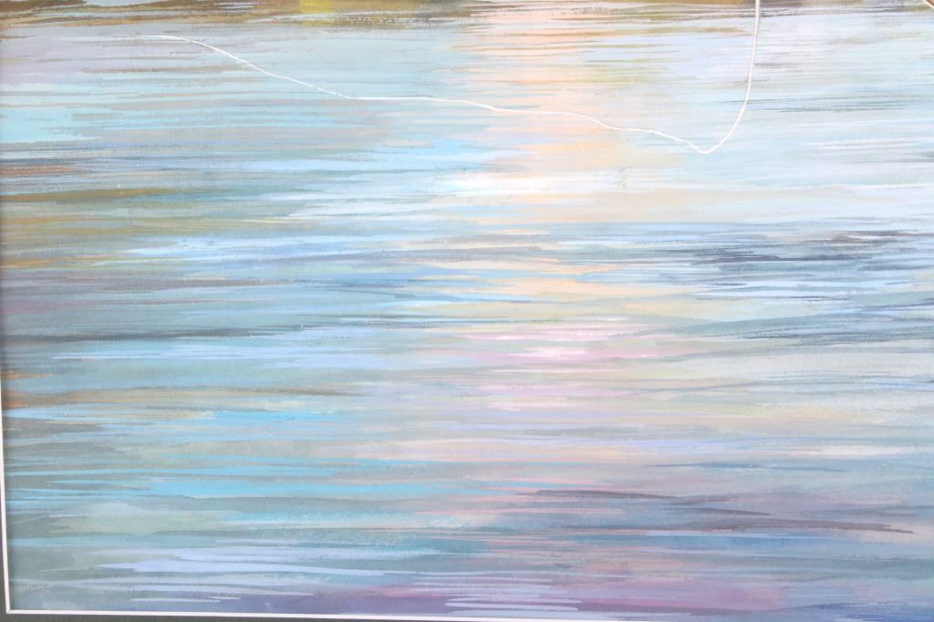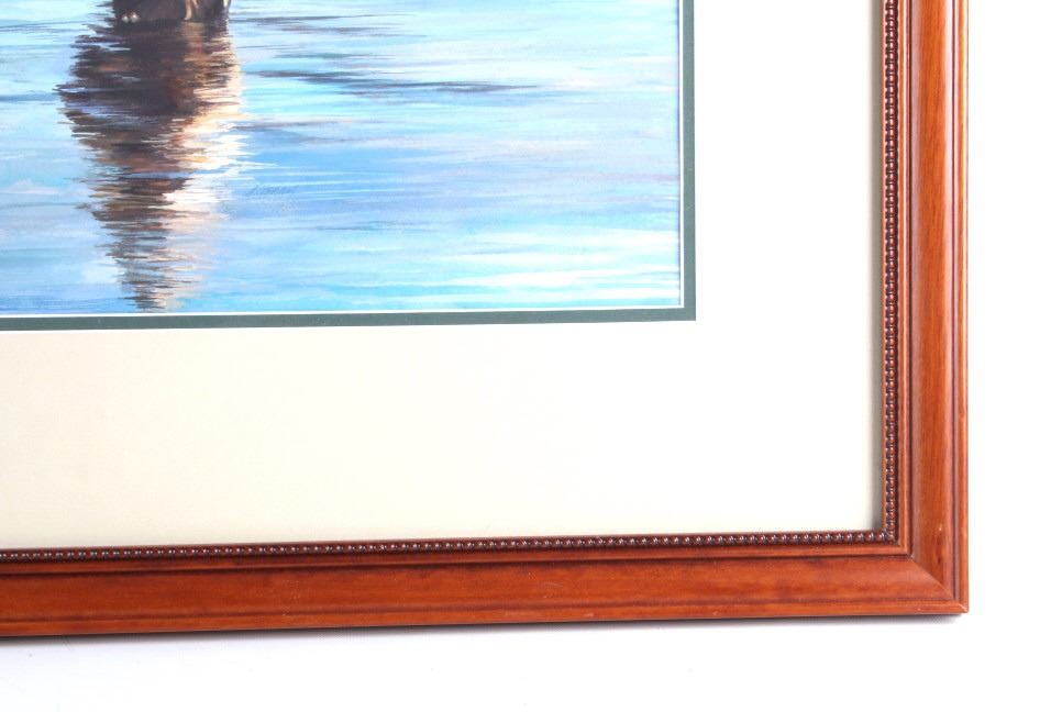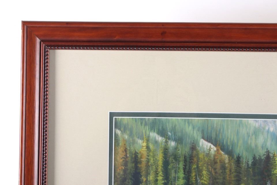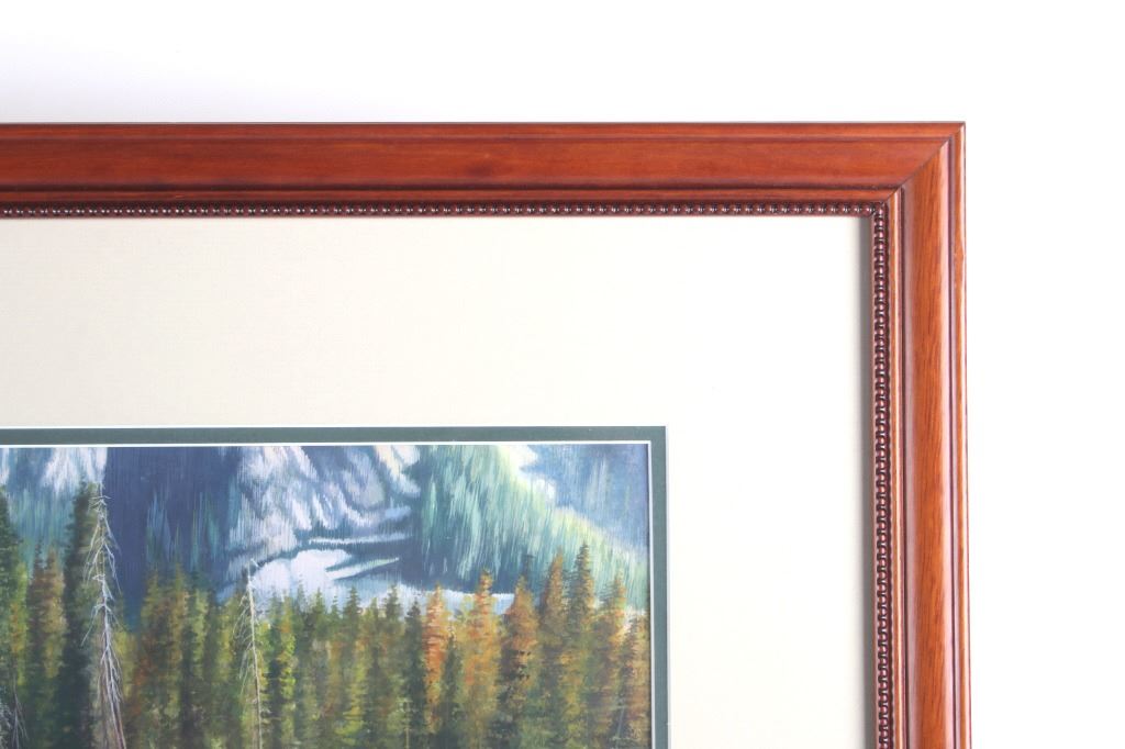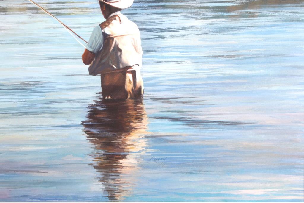 Offered in this lot is a wonderful, circa mid 1900's, large, original painting of a man fishing the Snake River with the Tetons and elk in the background. The painting features a man seen from behind, in waders and a straw cowboy hat, fly-fishing in what is believed to be the snake river. On the far bank are three cow-elk eating in a meadow. Beyond the meadow is timber with Tamarack/Larch just starting to turn golden. Behind the timber is the base of the Tetons just starting. This painting has been professionally double matted and framed. Unfortunately, if there is an artist mark or signature, it is covered by the matting. The lack of seen artist signature does not lessen the impressiveness of this painting. The seen art measures 24" x 18" and the frame measures 33" x 27 ½”. This item is in very good condition, showing no obvious signs of damage.