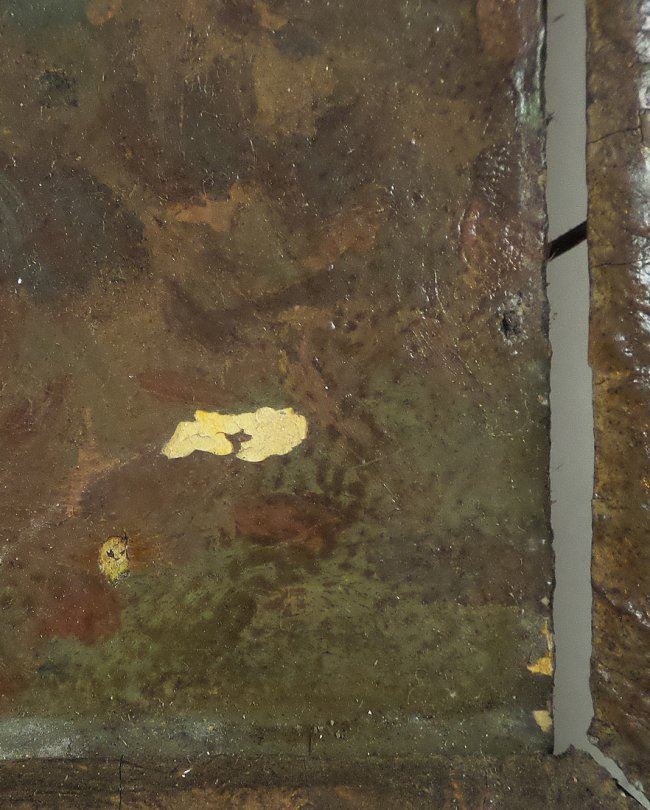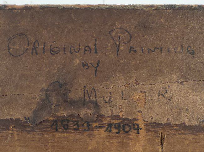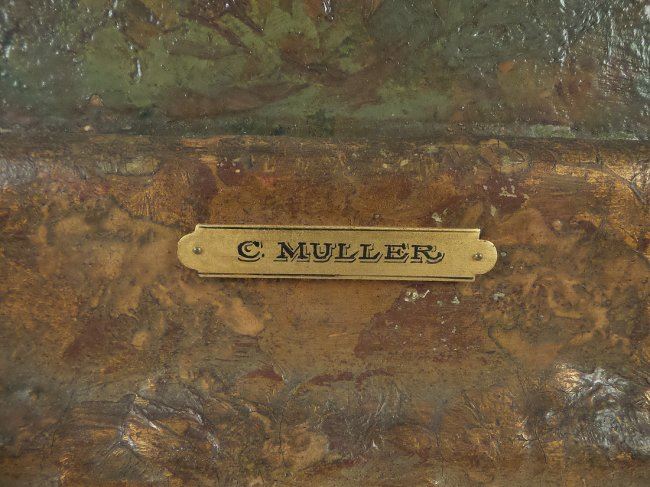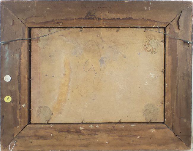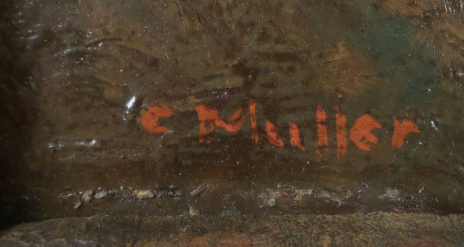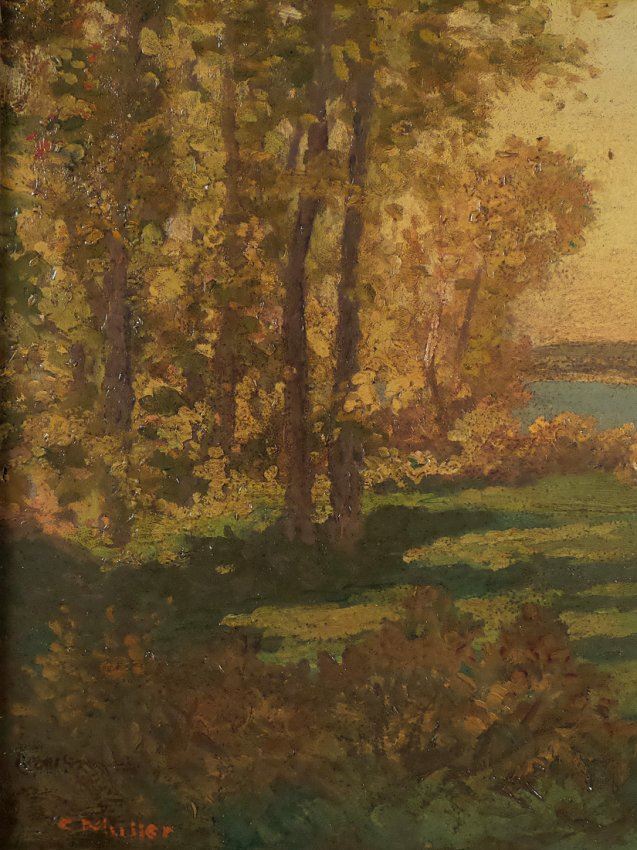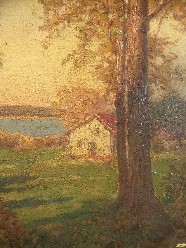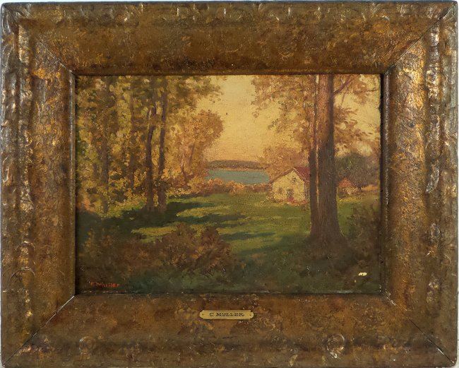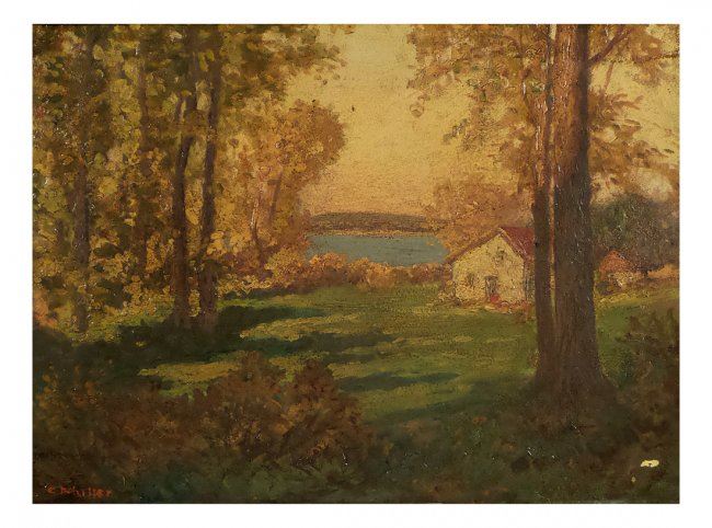 Carl Muller. Impressionist oil on artist board depicting a seaside home in autumn. Signed lower left in red, "C. Muller". [Sight: 10 1/2" x 14 3/4"; Frame: 17 1/2" x 21 3/4"]. Original Frame, Possibly artist frame; minor flaking at bottom right.