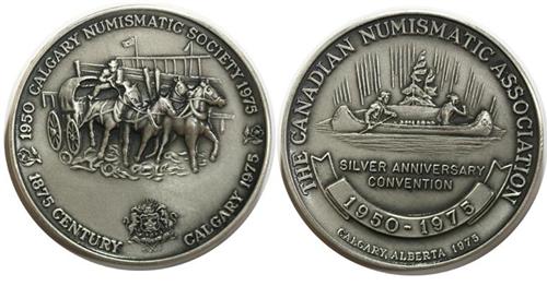 Beautiful commemorative Silver Medal issued for the 25th Anniversary of the Canadian Numismatic Association 1950-1975. High relief design, reverse portrait of a Chuckwagon with obverse of the voyageur.