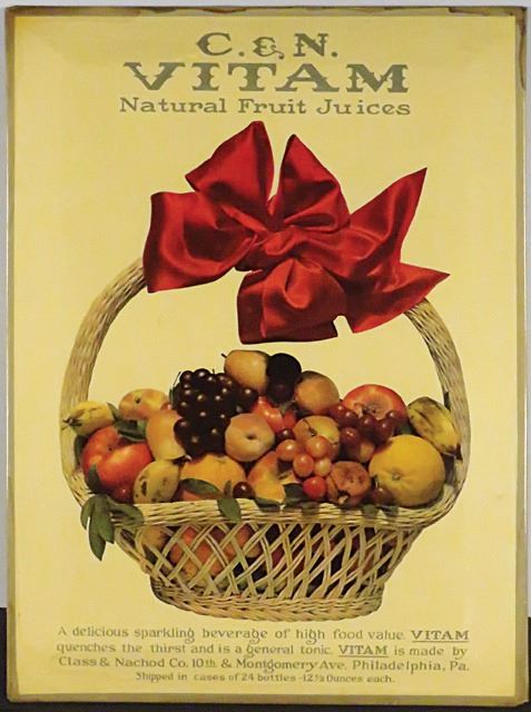C & N Vitam Natural Fruit Juices Celluloid Over Tin Advertising Sign. Discoloration at top perimeter and chips at two corners otherwise excellent condition. 11 1/2 X 15 1/2 inches.