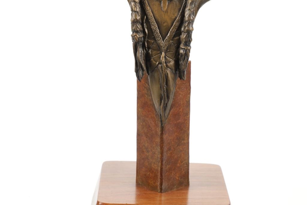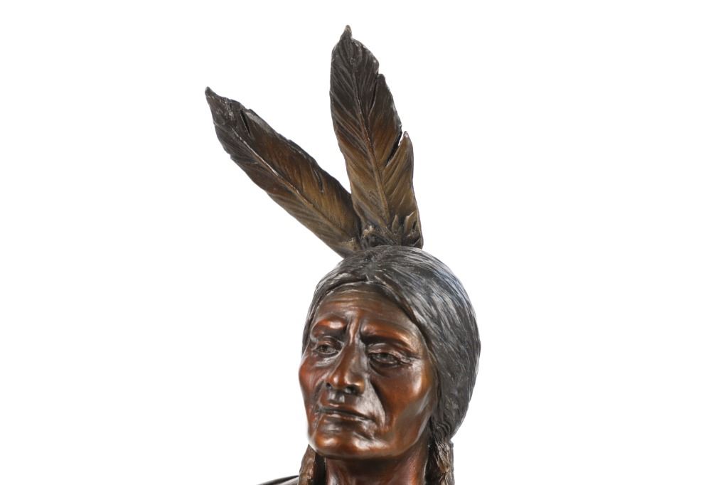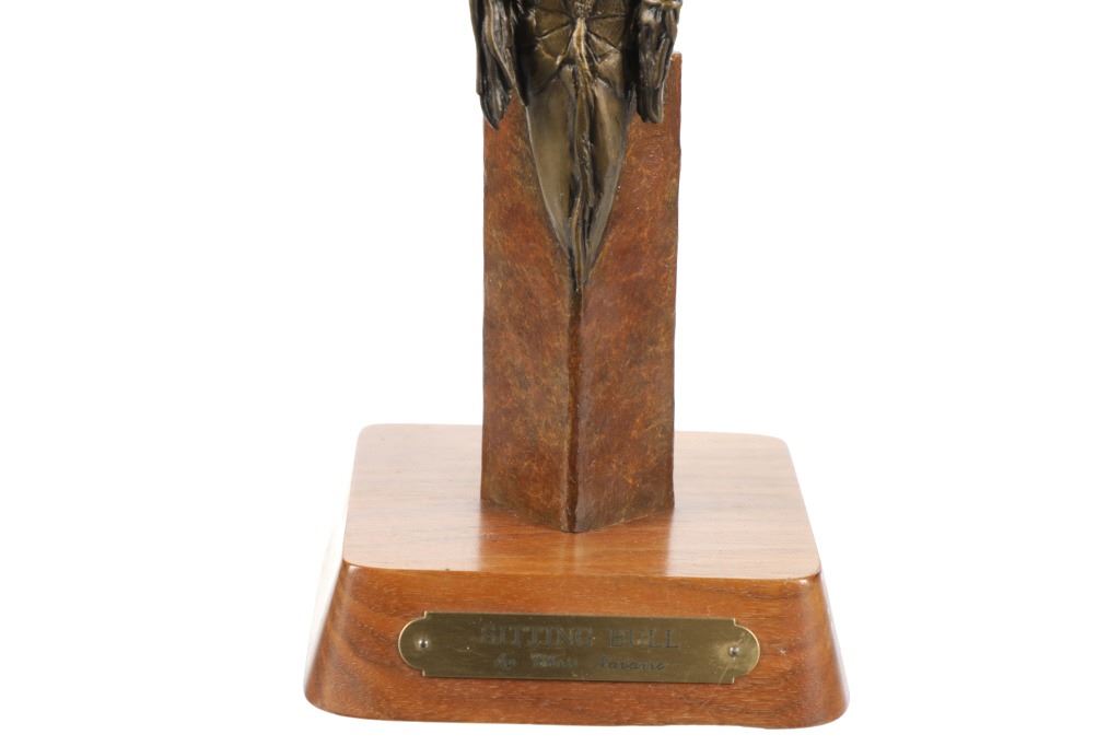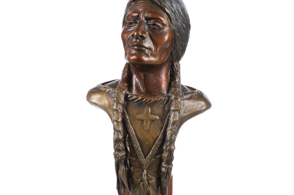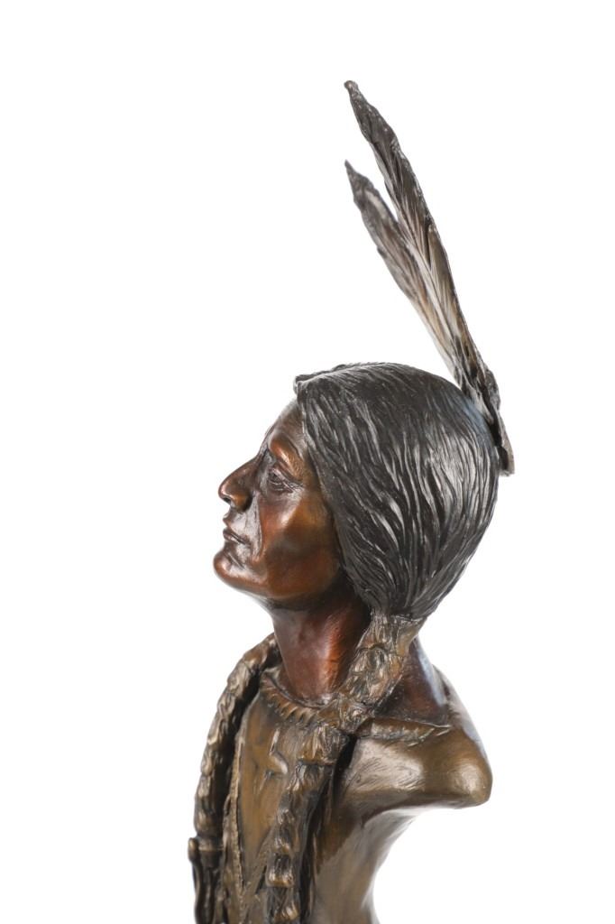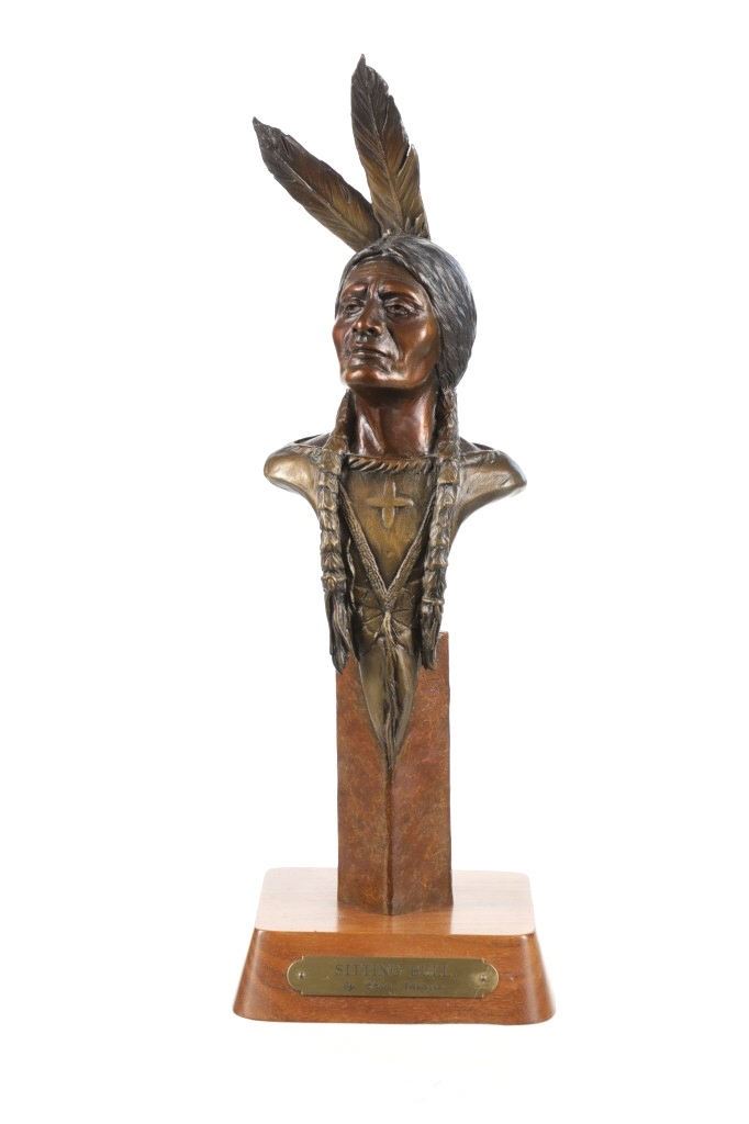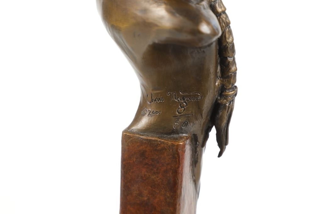 Featured in this lot is a limited edition bronze sculpture of Sitting Bull done by renowned sculptor Chris Navarro in 2000. This limited edition piece is numbered "8/50". Chris Navarro is an award-winning sculptor known for his dynamic bronze works depicting the spirit of the American West and its inhabitants. A former rodeo performer (bull and bronc rider), he created his first sculpture in 1980 after discovering a bronze of Steamboat and learning the skill from library books. In 1986, he made his professional debut with the composition "Spinnin' and Winnin'," which earned a local blue ribbon. Navarro, who is based in Casper, Wyoming and Sedona, Arizona, where he runs the Navarro Gallery in Tlaquepaque, has made over 34 large bronze sculptures for public locations across the country. This bronze shows a bust style of Sitting Bull, an iconic Hunkpapa Lakota leader who led his people during years of resistance against United States government policies. He has his chin slightly up and has a stoic look on his face as he looks slightly to the left of the viewer. He has two feathers in his hair and his hair is in two long braids. The sculpture sits on a wood stand with a metal plaque on the front reading, "Sitting Bull by Chris Navarro". The back of the sculpture is marked reading, "Chris Navarro 8/50 ©2000". It shows good condition overall with no wear or damage present. It measures 5 1/4" L x 5 1/2" W x 16" H and weighs 4 pounds and 14 ounces.*