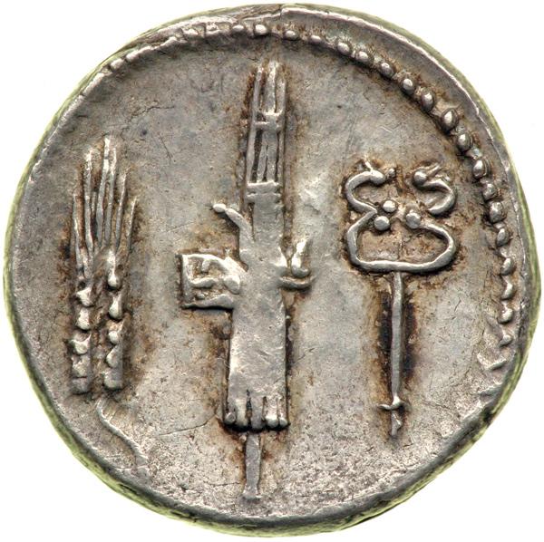 C. Norbanus, moneyer. AR Denarius minted at Rome, c. 83 BC. Diademed head right of Venus. Reverse: Ear of grain, fasces and caduceus. Norbana 2; Cr. 357/1b; Syd. 739. Extremely Fine.